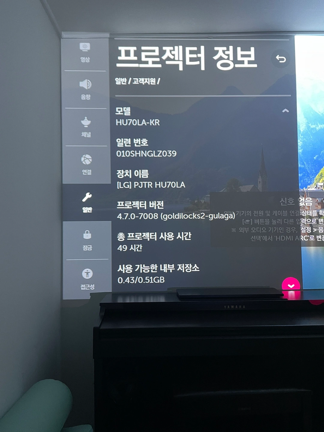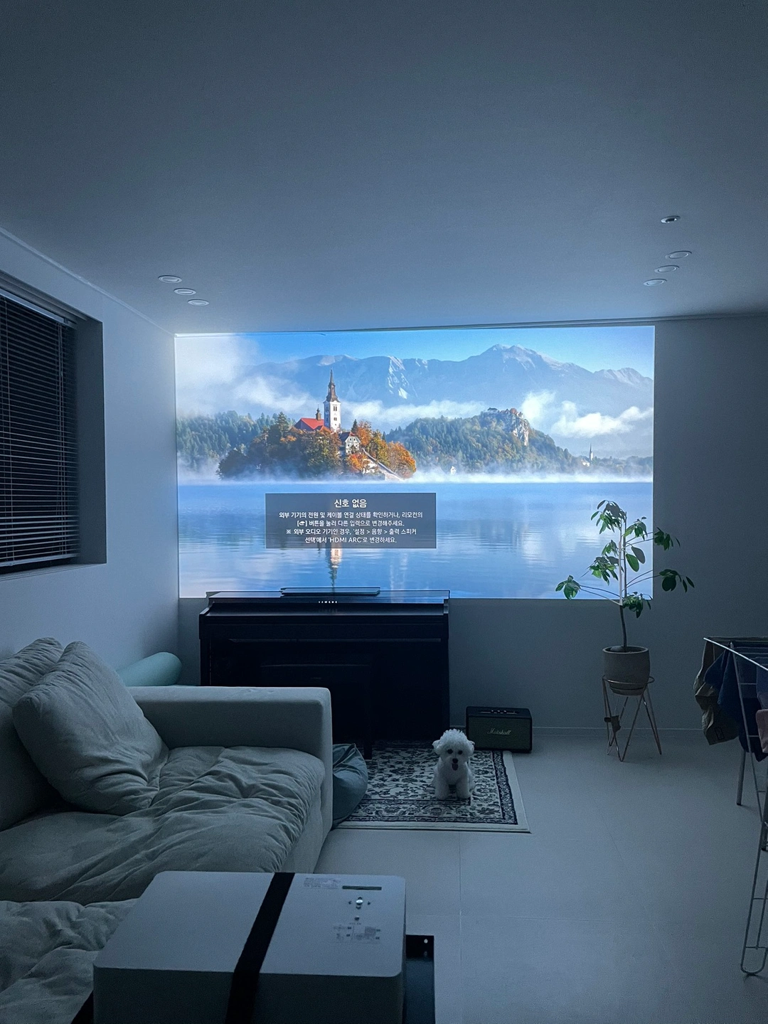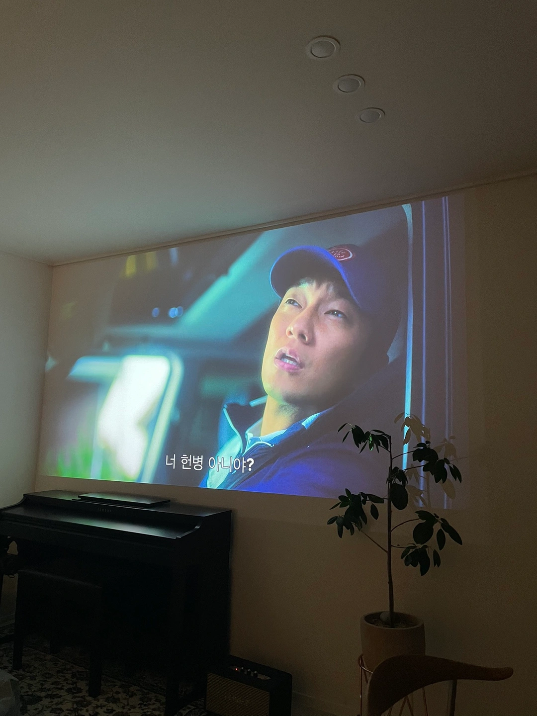 해상도 : 4K UHD 명암비 : 15,00안시루멘 렌즈수명 : 30,000 시간 돌비서라운드 WebOS 4.5 기본OS에 넷플릭스, 유튜브 등이 기본앱으로 깔려있어 연결이 편리합니다 2020.10월 구매하여 사용할때만 설치하고 파우 치에 보관해놨습니다. 50시간밖에 보지않은 특A급 컨디션 입니다. 이사할때 포커스링 돌리는 막대?가 깨졌습니다. (손끝으로 돌릴수있고 한번 위치 잡아놓으면 조절할 일은 별로 없습니다) 박스 같이 보관중이고 주문하시면 별도로 구매한 스탠드 같이 드립니다.