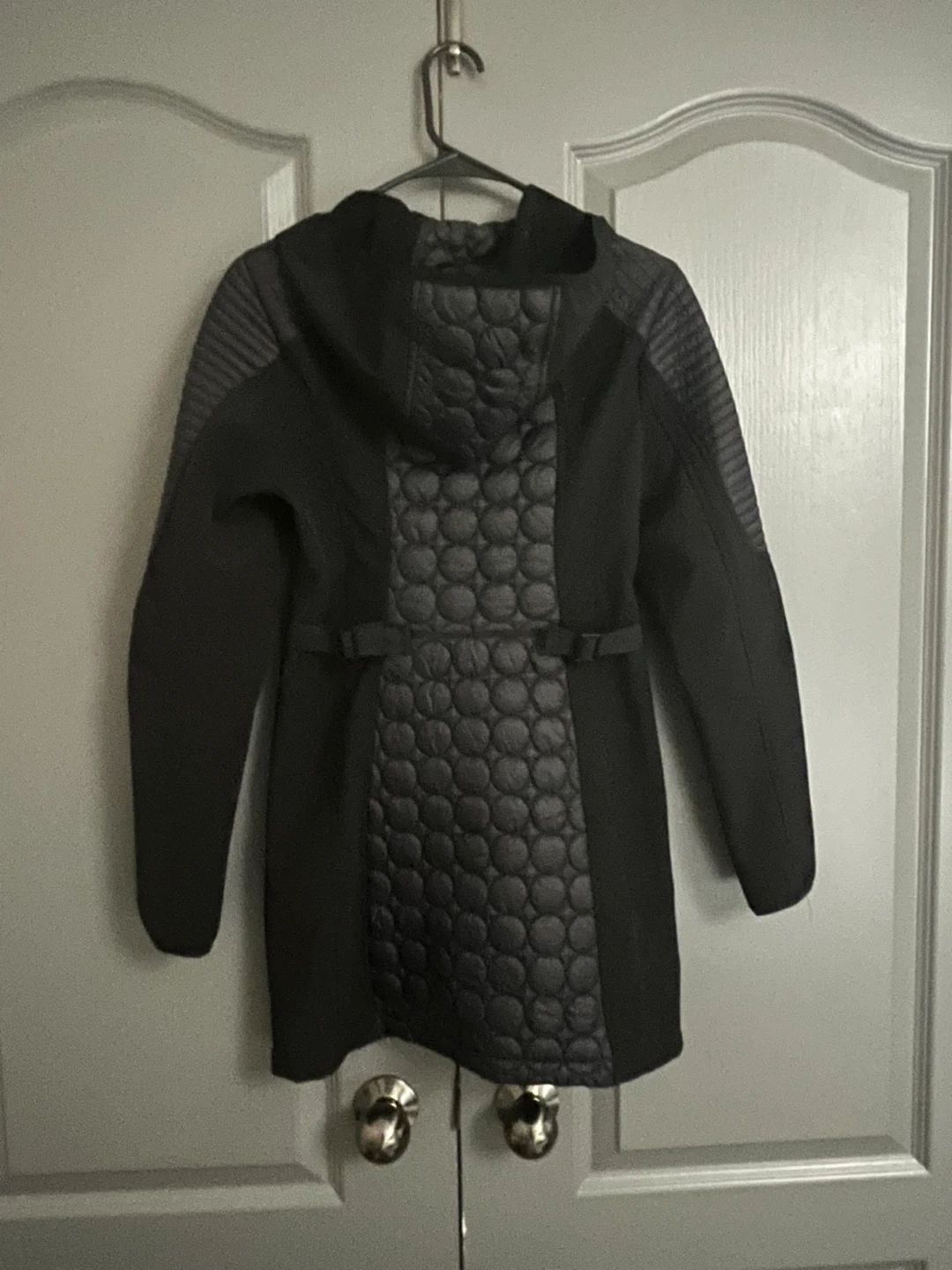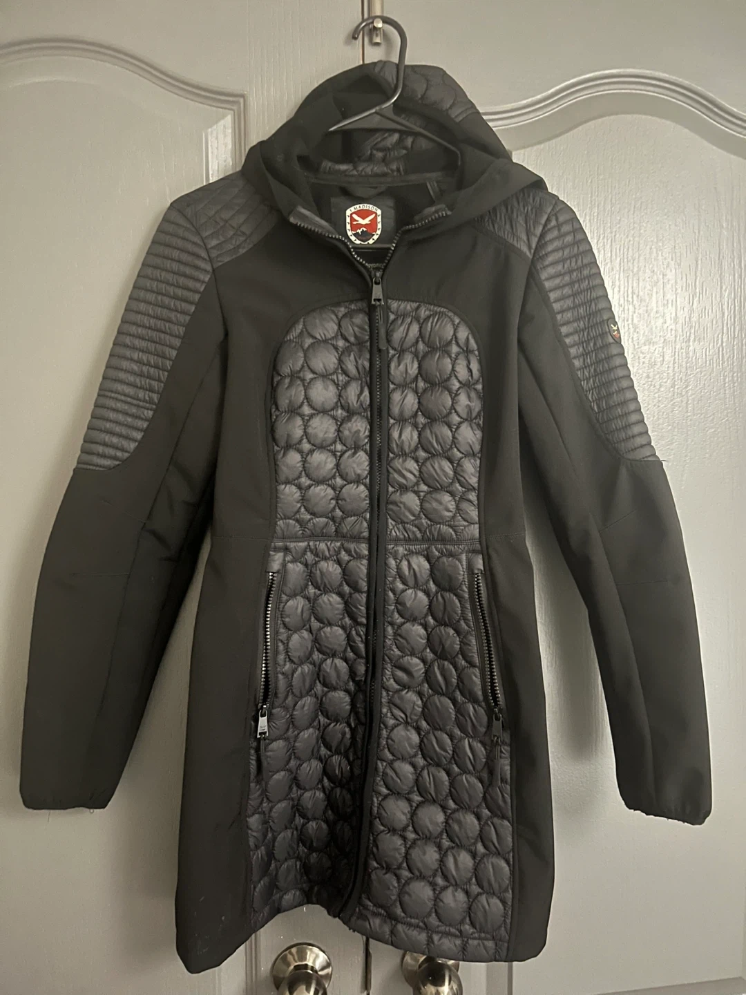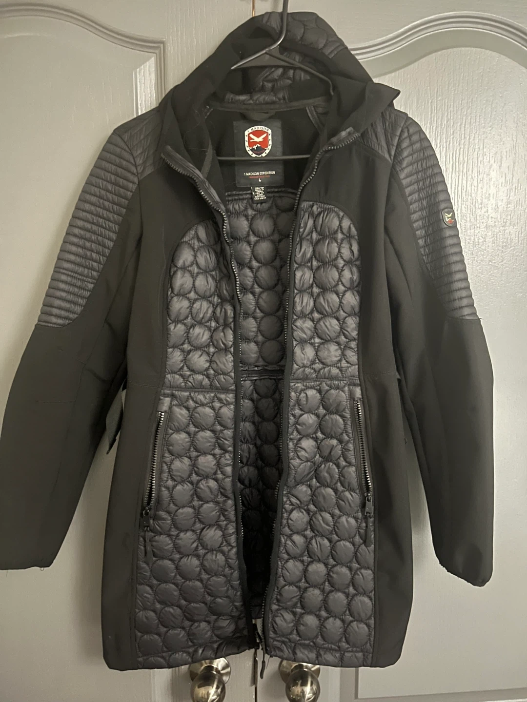 Selling a 1 Madison Expedition coat in black, size x small. It's in excellent condition and has a stylish quilted design on the front and back. Perfect for staying warm for spring and fall weather