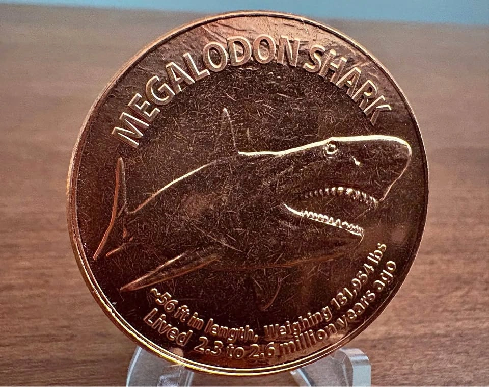 *update - one sold, one remaining* 1oz .999 fine copper bullion Megalodon shark round. Comes with soft clear plastic protective coin flip included. Obverse: Features a prehistoric megalodon shark looming into the center of the round along with the animal's name semi-circumscribed above. Below are a few details about this remarkable creature. Reverse: Displays an eagle with a shield carrying an olive branch and arrows in its talons. Metal weight and purity appear above and below. Has a nice milled edge as seen above. Can meet in public place in Maple Ridge. Include stand - add $3 Include protective capsule - add $3 The stand is too thick to be purchased in person. Check out my other listings for more unique bullion items & gift ideas.