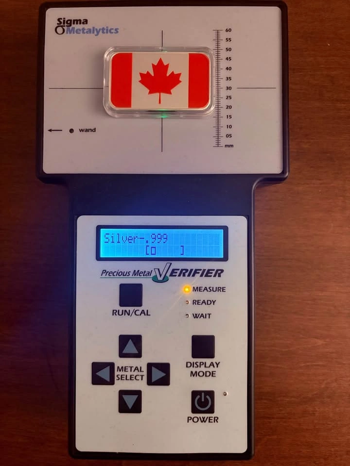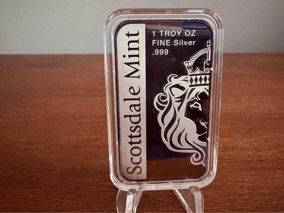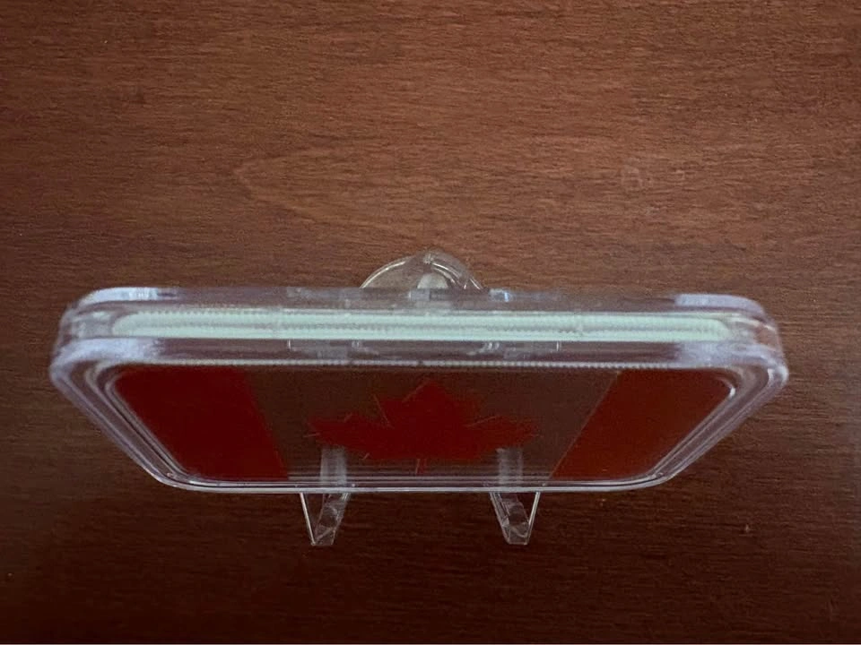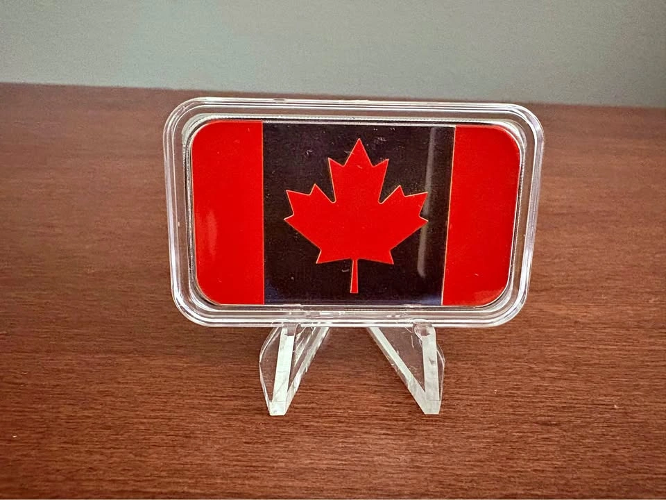 1 oz .999 Fine/pure silver bullion Canada flag bar from Scottsdale Mint. Beautiful bar with a mirror-like finish. Hard protective capsule included. Great gift idea that is both unique and will only increase in value over the long term with the price of silver. In mint condition and Sigma precious metals verifier certified. Can meet in a public place in Maple Ridge. Include stand - add $3 The stand is too thick to be purchased in person. Thanks! Price can be subject to change with significant market fluctuations in silver spot price.