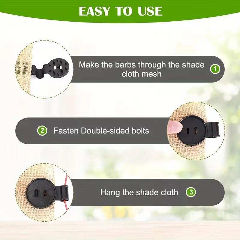 100Pcs Shade Cloth Clips, Durable Plastic Lock Grip Sun Shade Large Fixing Clip for Outdoor Garden Agricultural Greenhouse Anti Bird Netting, Black About this item Size: The shade cloth plastic clip measures approximately 4.1x1.5 inches / 10.5x3.7cm open and 2.17 inches / 5.5cm closed, which is compact and lightweight, easy to carry and store, and does not take up much storage space. Packing List: 100Pcs durable shade cloth clips. Advantage: These sunshade fabric plastic clips are made of durable quality plastic, strong and reliable, not easy to break or deform, and can withstand strong winds and harsh weather conditions. They provide effective protection against birds and keep your sunshade firmly in place. Instruction: Shade fabric locking clips are easy to install. When using them, first let the barbs pierce through the shade netting, then press down hard on the plastic tip to lock the clips in place, and then pass the rope through the rope hole so that the shade netting can be secured. Application: The sunshade net fixing clip is suitable for all kinds of fabrics with mesh, including shade netting, insulation netting, bird netting, garden plant netting, and agricultural netting, which not only protects plants from the sun and birds, but also provides a cool and comfortable environment for you to relax in your garden, preventing birds from disturbing your rest time. Notice: Mesh shade nets are recommended and are not suitable for use with shade cloth fabrics that are too thick. Please do not hesitate to reach out to Richard by email to schedule a pickup time.