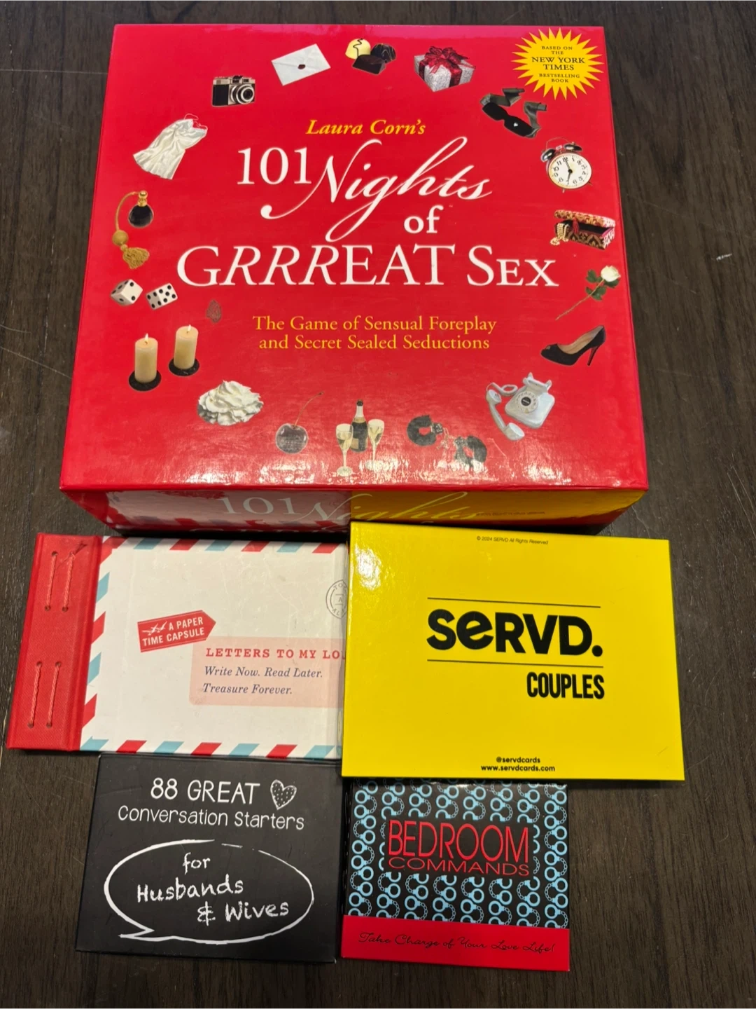 Selling a collection of adult-themed games and conversation starters for couples! Included are: - Laura Corn's 101 Nights of Grrreat Sex - A Paper Time Capsule: Letters to My Love - Servd Couples Game - 88 Great Conversation Starters for Husbands & Wives - Bedroom Commands In new or near new condition. Asking $25 for everything. Located in Cougar Ridge.