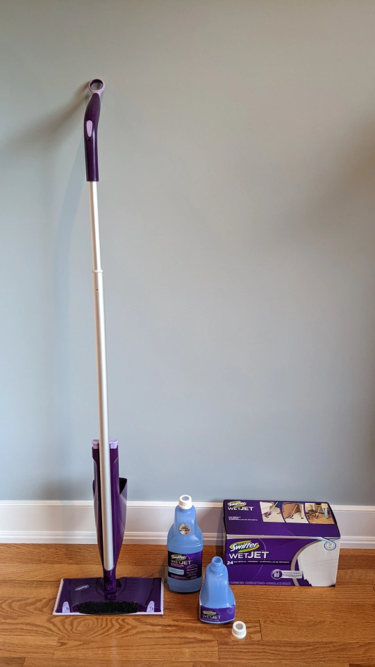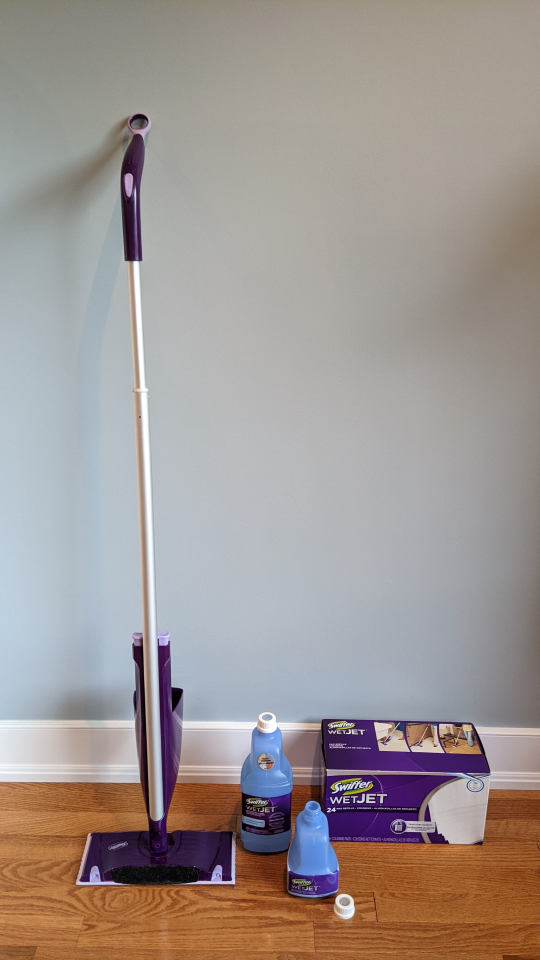 Taking up space; never use it. - Battery Operated Mop - 24 Pads - 1 Bottle Multi-Surface Cleaning Solution (full) - 1 Mini Re-fillable Bottle (empty)
