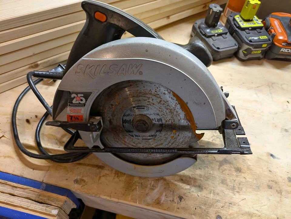 Skillsaw with 10A motor, includes blade change wrench, adjustable depth and angle. Cord has some minor damage but nicely taped up.