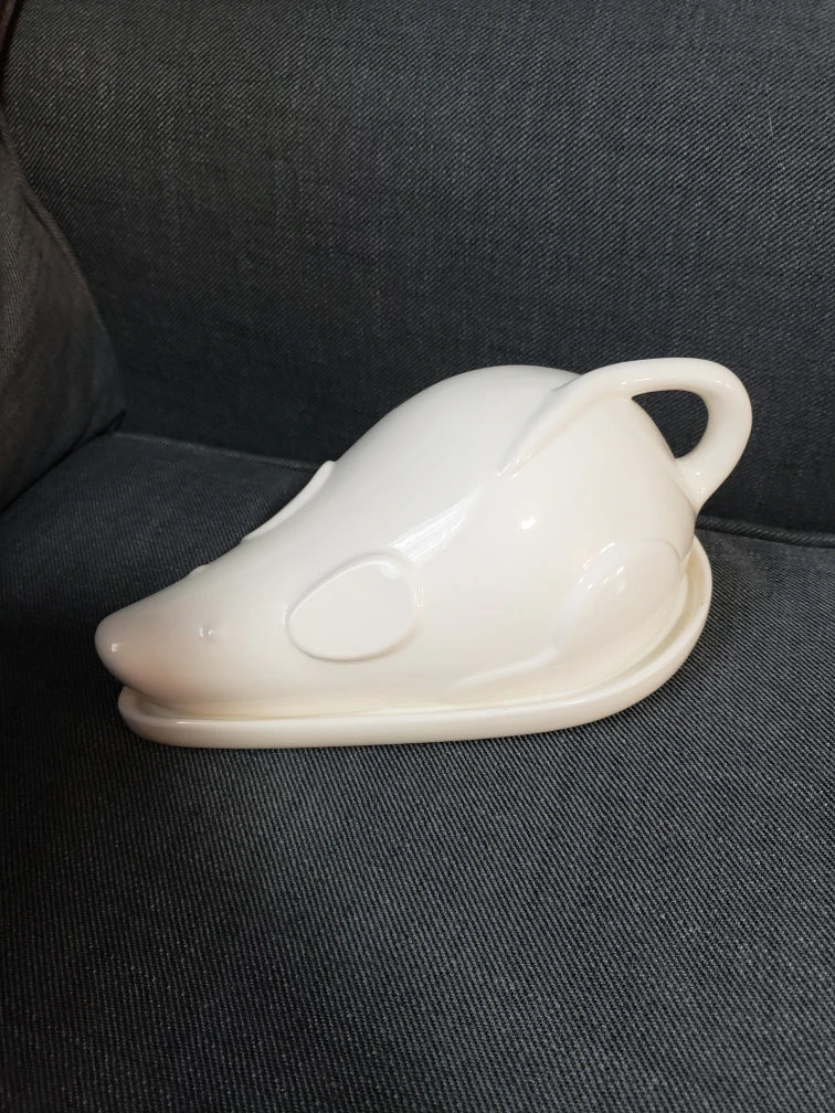 White ceramic cheese plate with mouse shaped lid. About 9 inches long and 4 inches tall. Pick up in south Ajax.