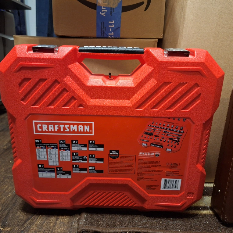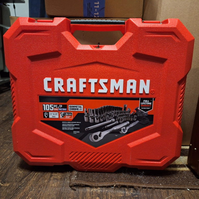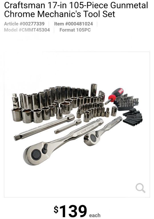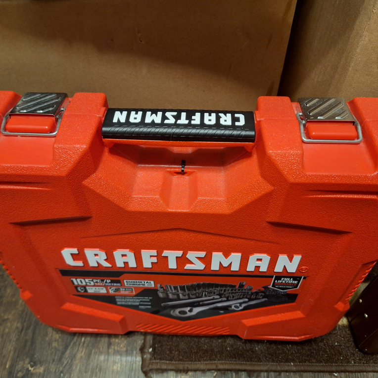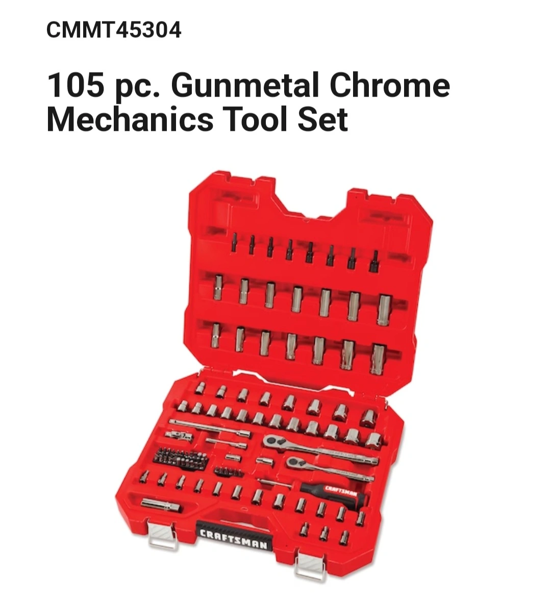 CMMT45304 105 pc. Gunmetal Chrome Mechanics Tool Set Product Overview Made for the auto-enthusiast, semi-pro, or do-it-yourselfer, the Gunmetal Chrome Mechanics Tool Set comes with the 120-tooth Quick Release Ratchets which provide maximum accessibility to tight spots. With their slim head and 3-degree arc swing, you can get into narrow spaces with ease and quickly tighten or loosen a fastener. All tools meet or exceed ASME specifications and are backed by the CRAFTSMAN Full Lifetime Warranty. Take on your next project with the Gunmetal Chrome 105 pc. Mechanics Tool Set. Includes (8) 1/4-in. Drive Standard 6 PT Sockets SAE - 5/32-in., 3/16-in., 7/32-in., 1/4-in., 5/16-in., 3/8-in., 7/16-in., 1/2-in. (7) 1/4-in. Drive Standard 6 PT Sockets MM - 4, 5, 6, 7, 8, 9, 10mm (8) 3/8-in. Drive Standard 6 PT Sockets SAE - 3/8-in., 7/16-in., 1/2-in., 9/16-in., 5/8-in., 11/16-in., 3/4-in., 13/16-in. (12) 3/8-in. Drive Standard 6 PT Sockets MM - 10, 11, 12, 13, 14, 15, 16, 17, 18, 19, 21, 22mm (14) 3/8-in. Drive Deep 6 PT Sockets SAE - 3/8-in., 7/16-in., 1/2-in., 9/16-in., 5/8-in., 11/16-in., 3/4-in. (2) Pear Head Ratchet (1/4-in, 3/8-in.) (2) Drive Bit Adapter (1/4-in, 3/8-in.) (1) 3/8-in. Drive 6 PT Spark Plug Socket - 5/8-in. (1) 3/8-in. Universal Joint (8) Nut Driver Bits - 4, 5, 6, 7, 8, 9, 10, 11mm (1) 3/8-in. Drive Extension Bar - 6-in. (1) 1/4-in. Drive Extension Bar - 3-in. (1) 1/4-in Spinner Handle (39) Specialty Bits condition brand new price firm Danforth and Eglington Pick up only