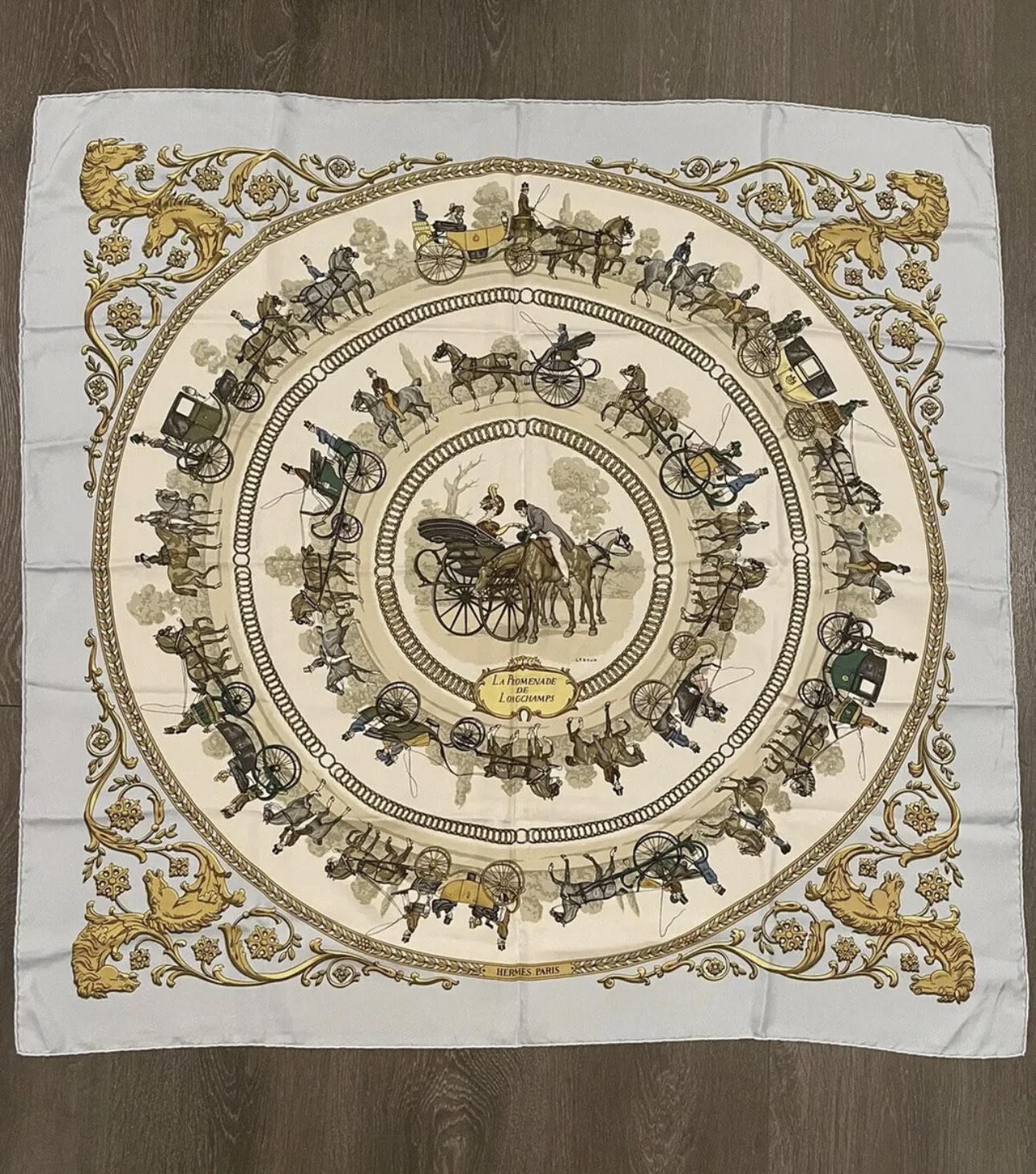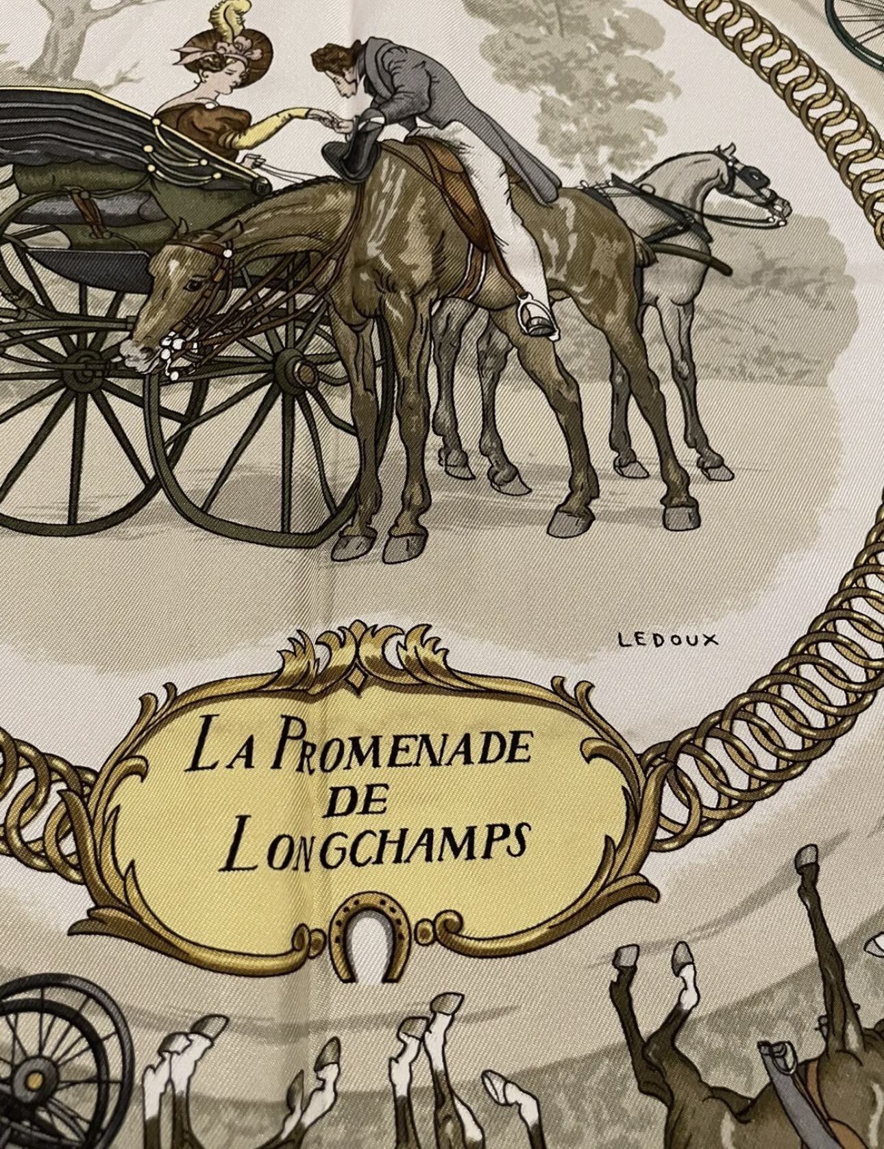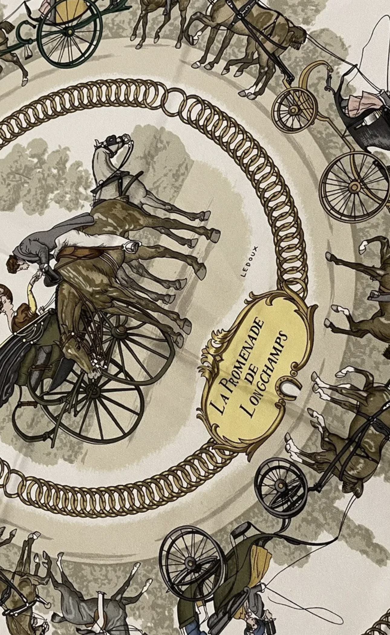100% Authentic Hermes Silk Scarf Carres La Promenade De Longchamps Ledoux Light Blue 90 x 90 cm Great condition