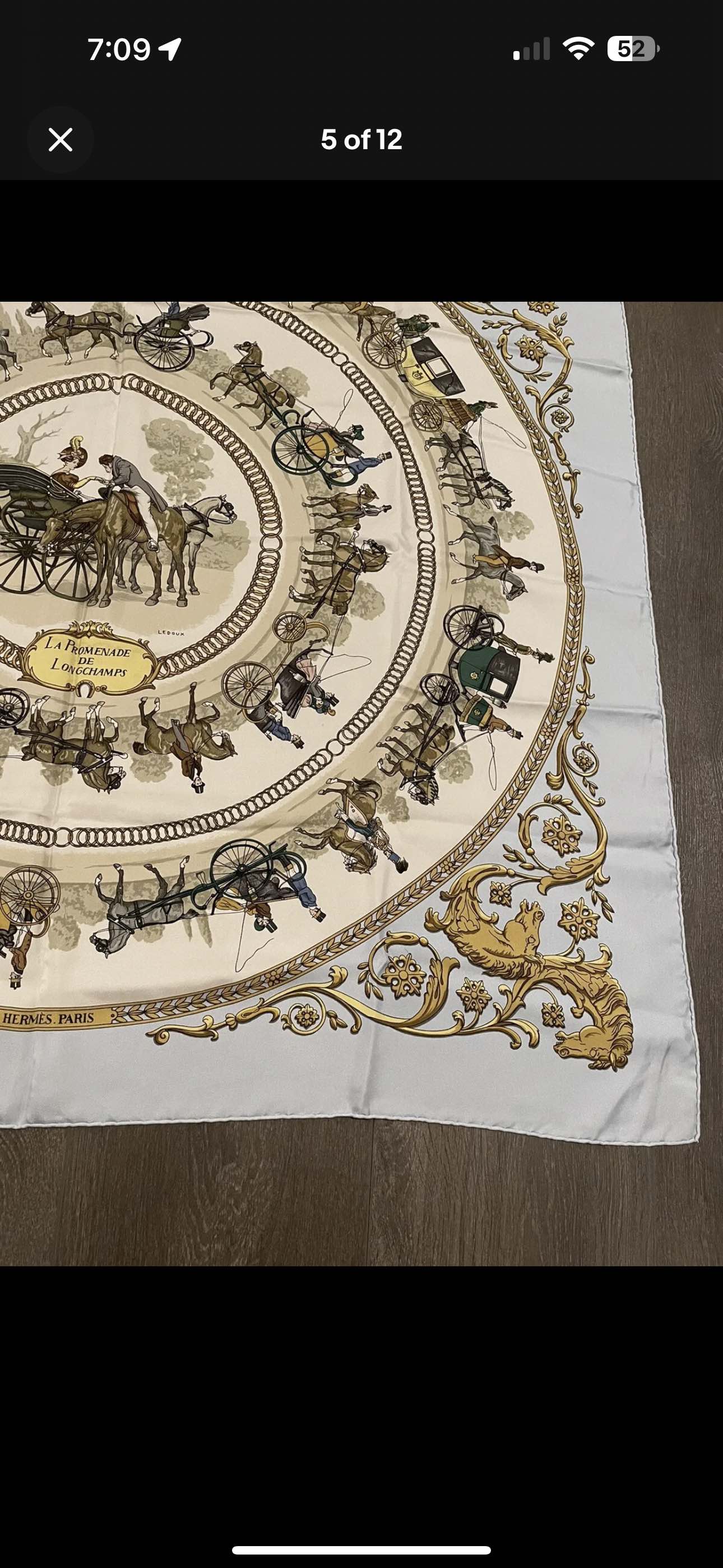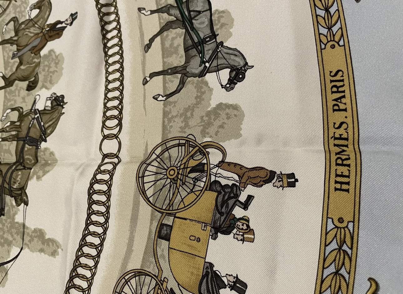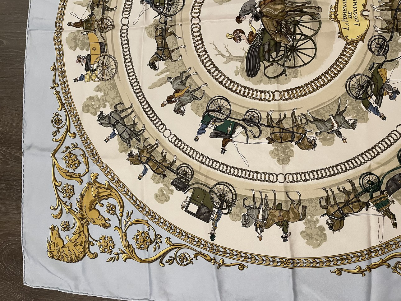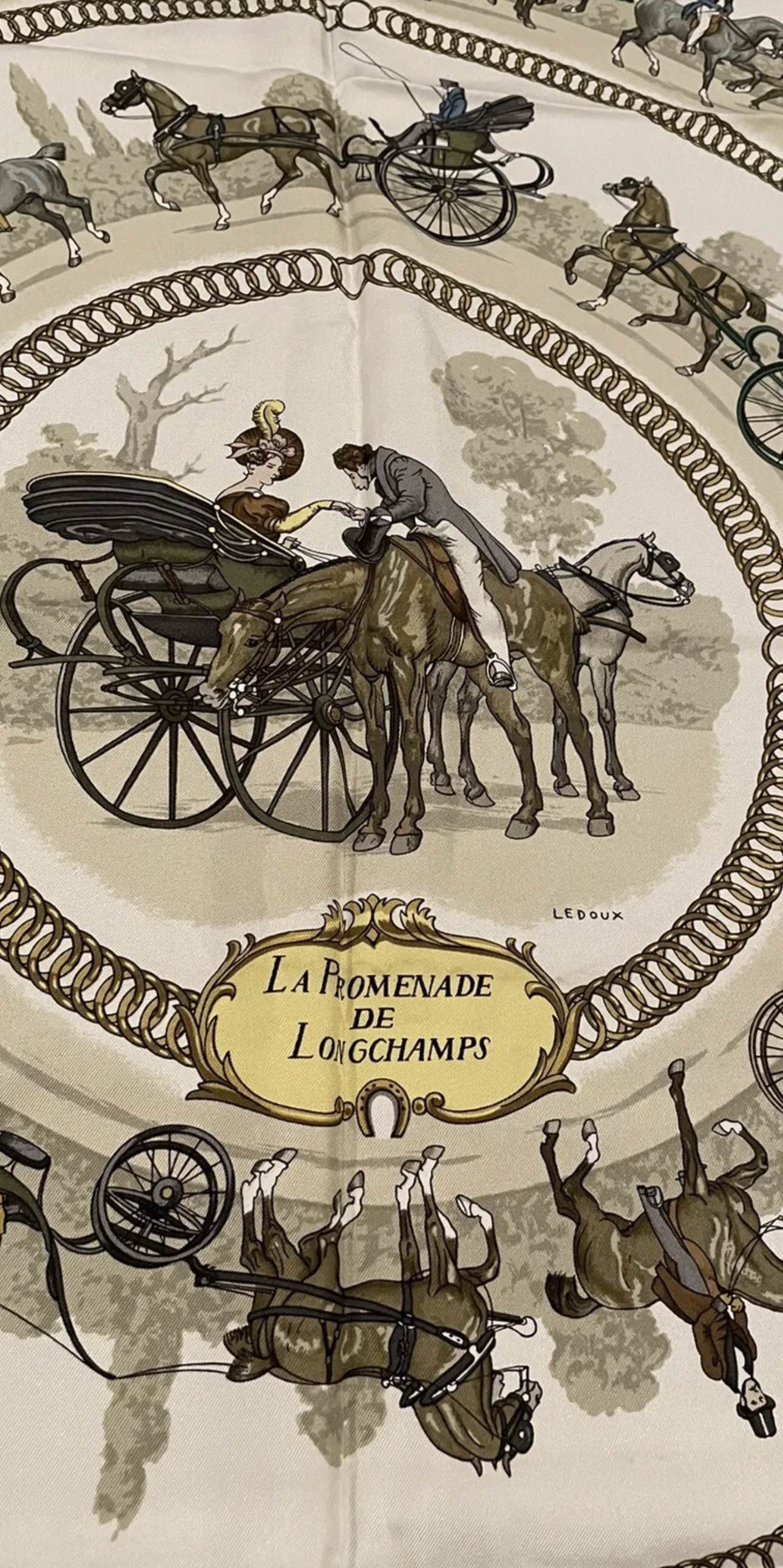 100% Authentic Hermes Silk Scarf Carres La Promenade De Longchamps Ledoux Light Blue 90 x 90 cm Great condition