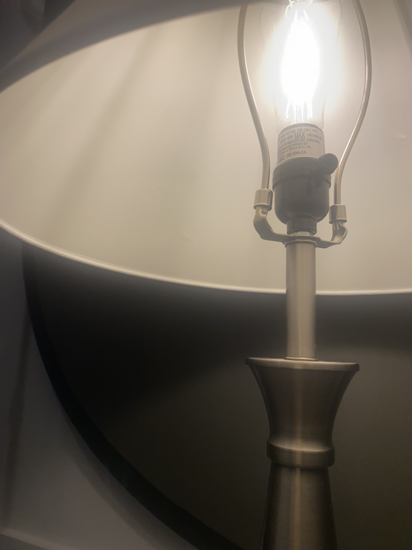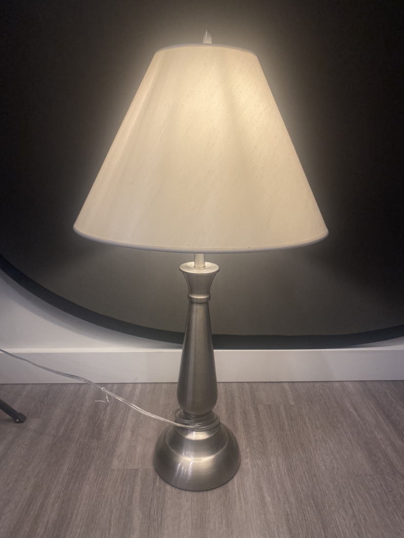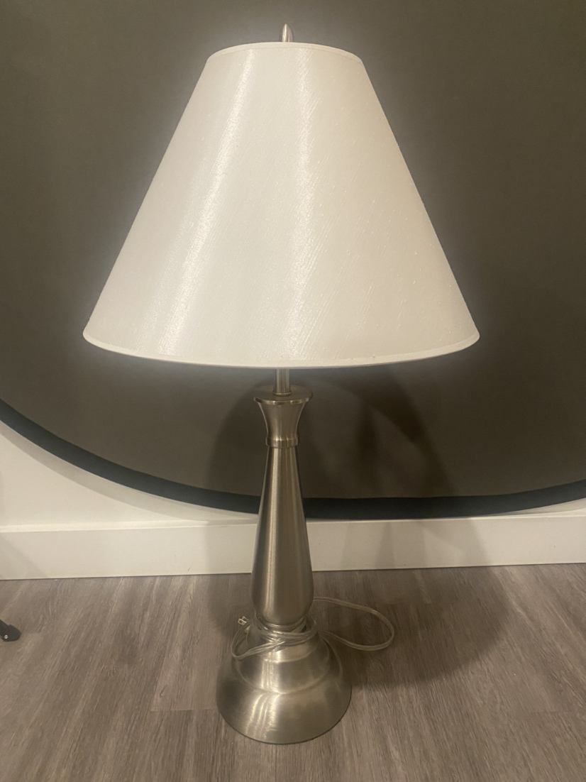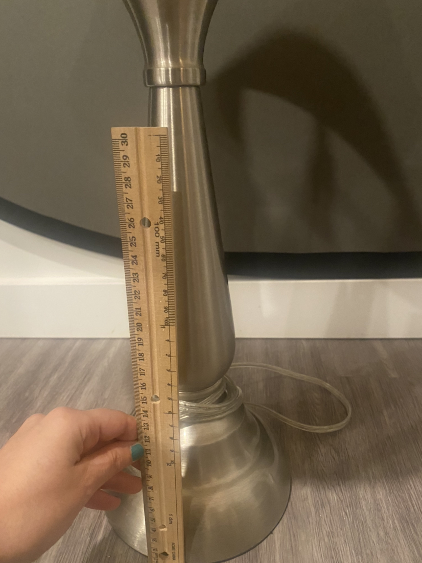 Beautiful, large lamp. Silver, chrome base and a white shade. Warm lighting. Ruler to show a rough estimate of how tall it might be. I’m guessing around 68 centimetres. I can update to the exact height when I find my tape measure! :)