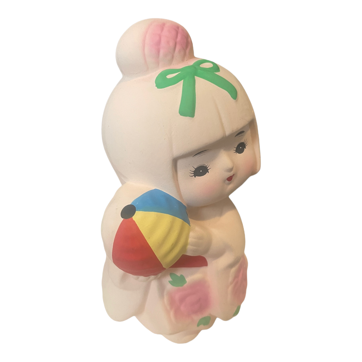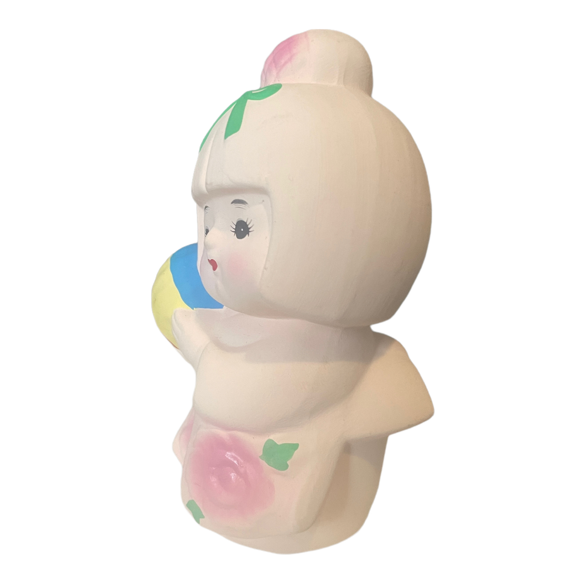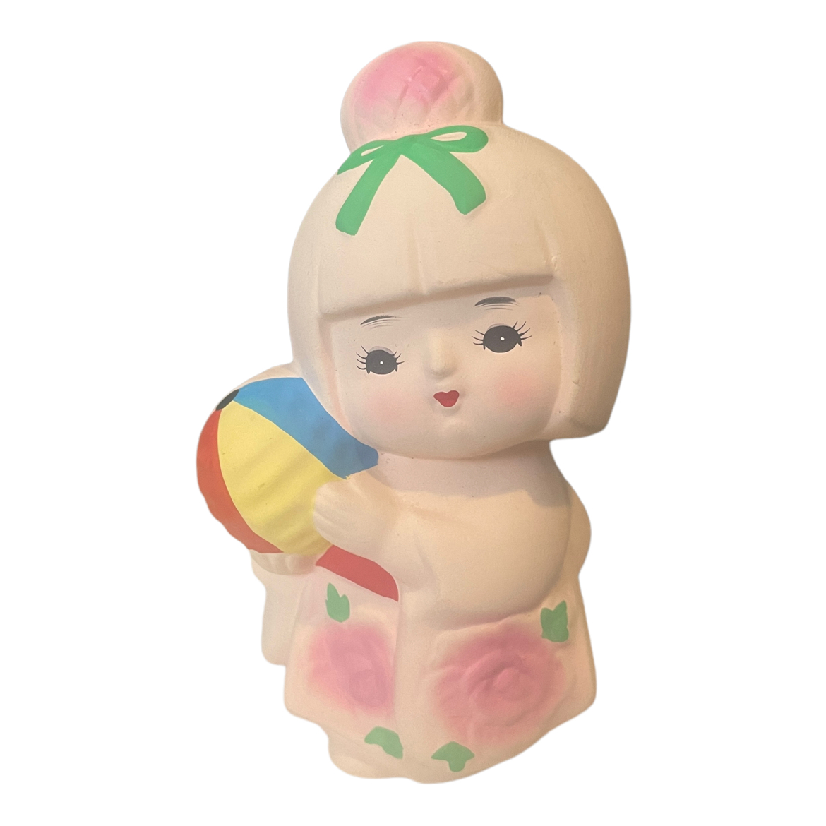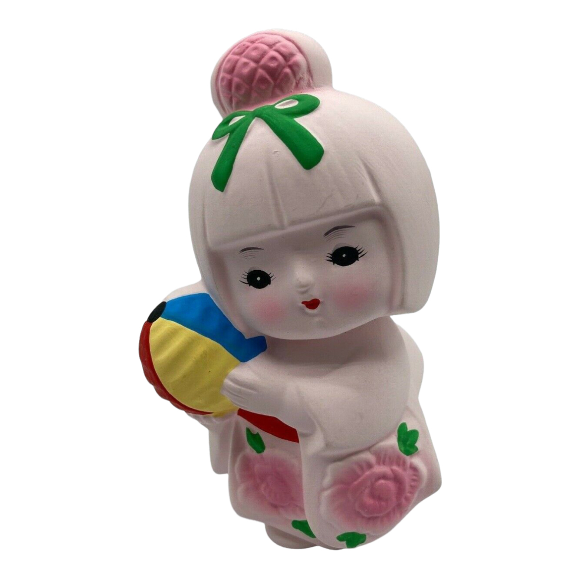 Japanese Geisha Girl Ceramic Figurine Vintage Collectible Great condition - no chips Size: 3" x 5" approx Maiko lady hand painted wearing a pink flower kimono and holding a ball. This is a really nice piece for the decorator or collector. A Beautiful Piece!! Made in Japan, sometime around 1960s - 1985ish.