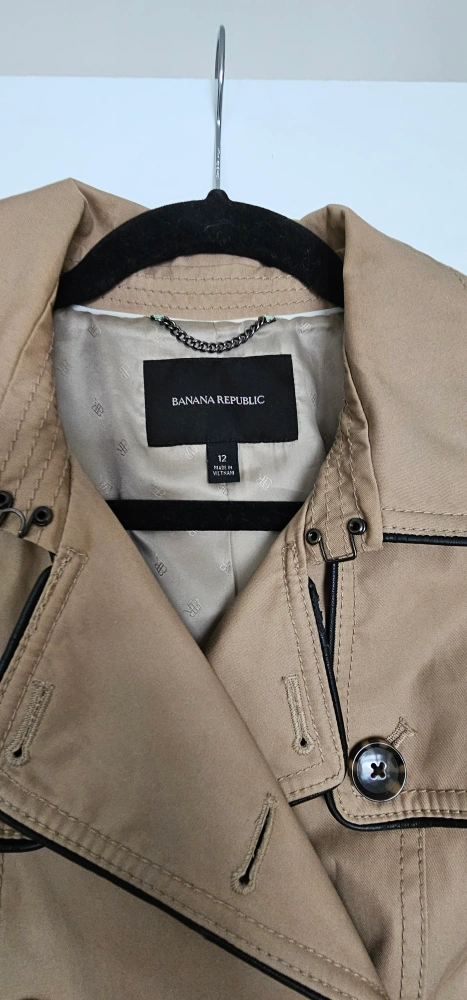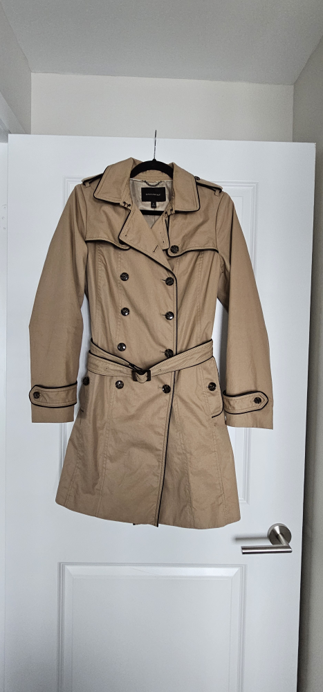 Women's Banana Republic Belted Trench Coat (knee length). Used condition. Colour: Khaki Size: 12 Material: Cotton Exterior & Polyester lining.