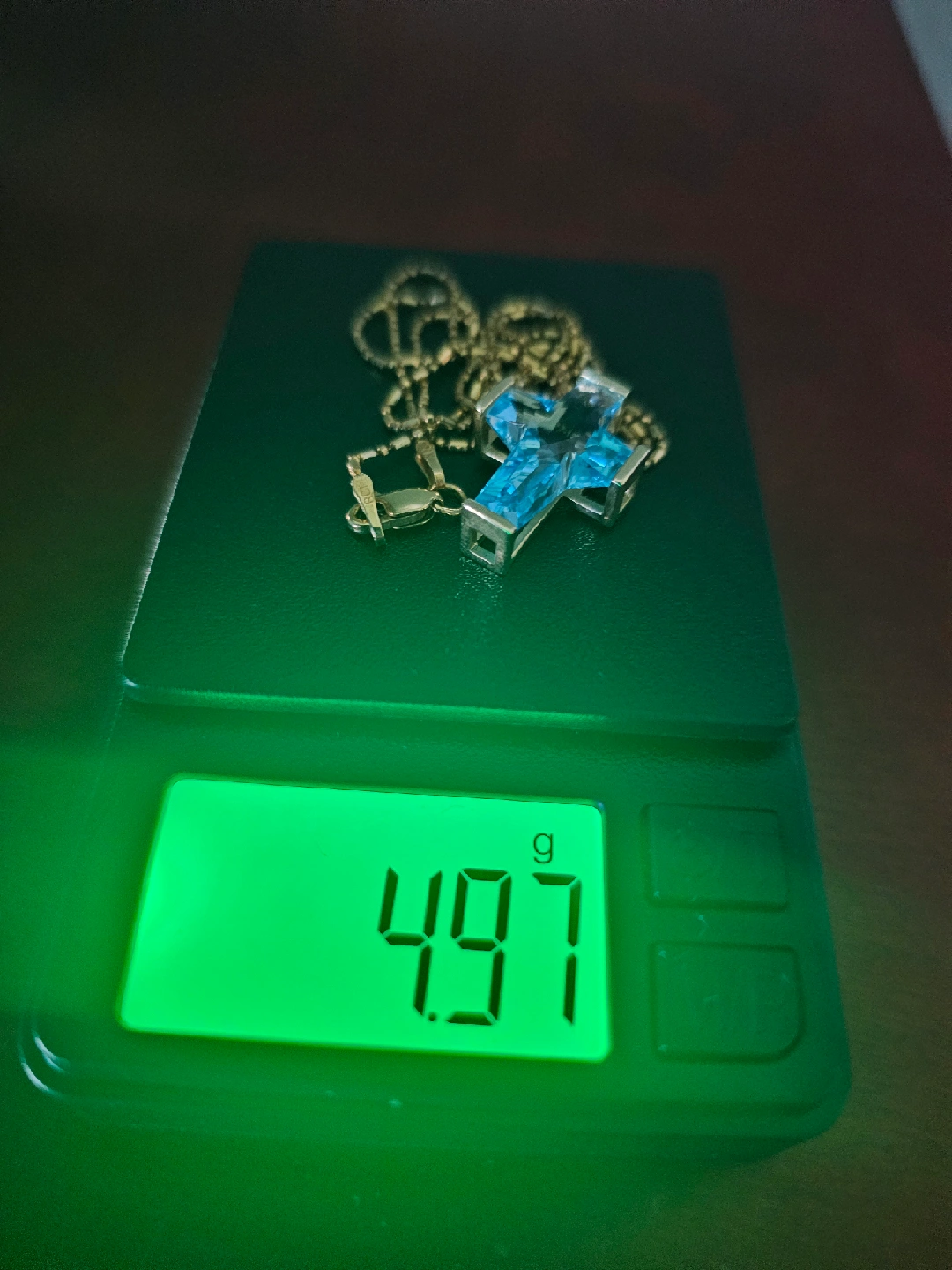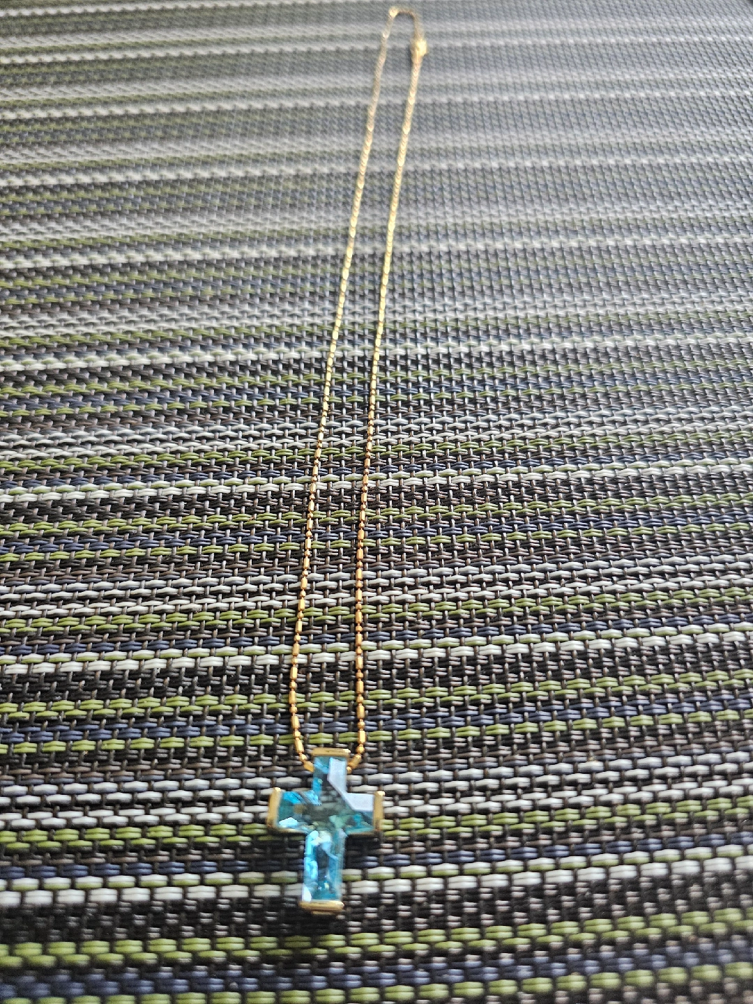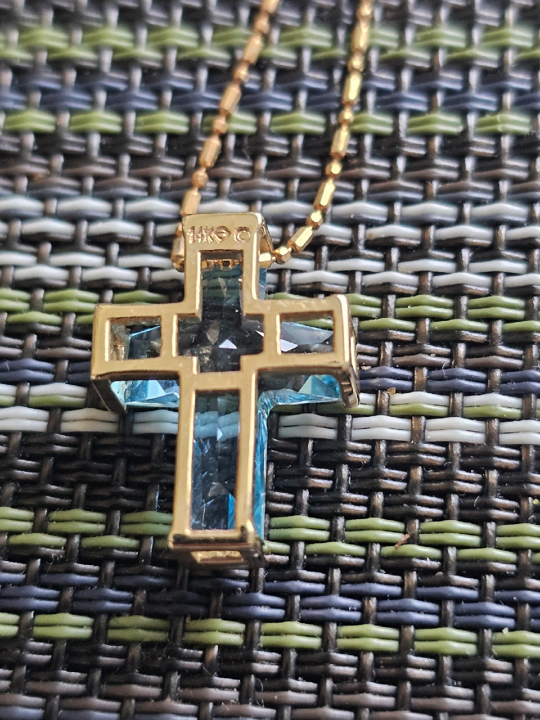 A lovely 14K gold cross pendant featuring beautiful blue stones. It weighs approximately 4.97 grams and would make a wonderful addition to any jewelry collection