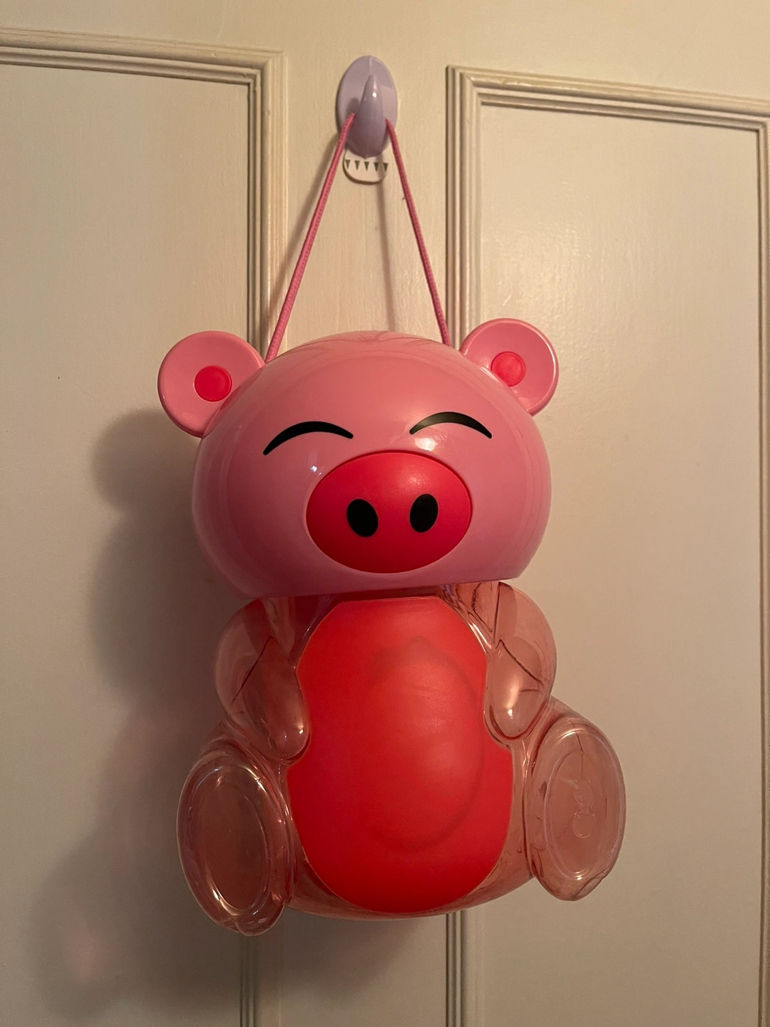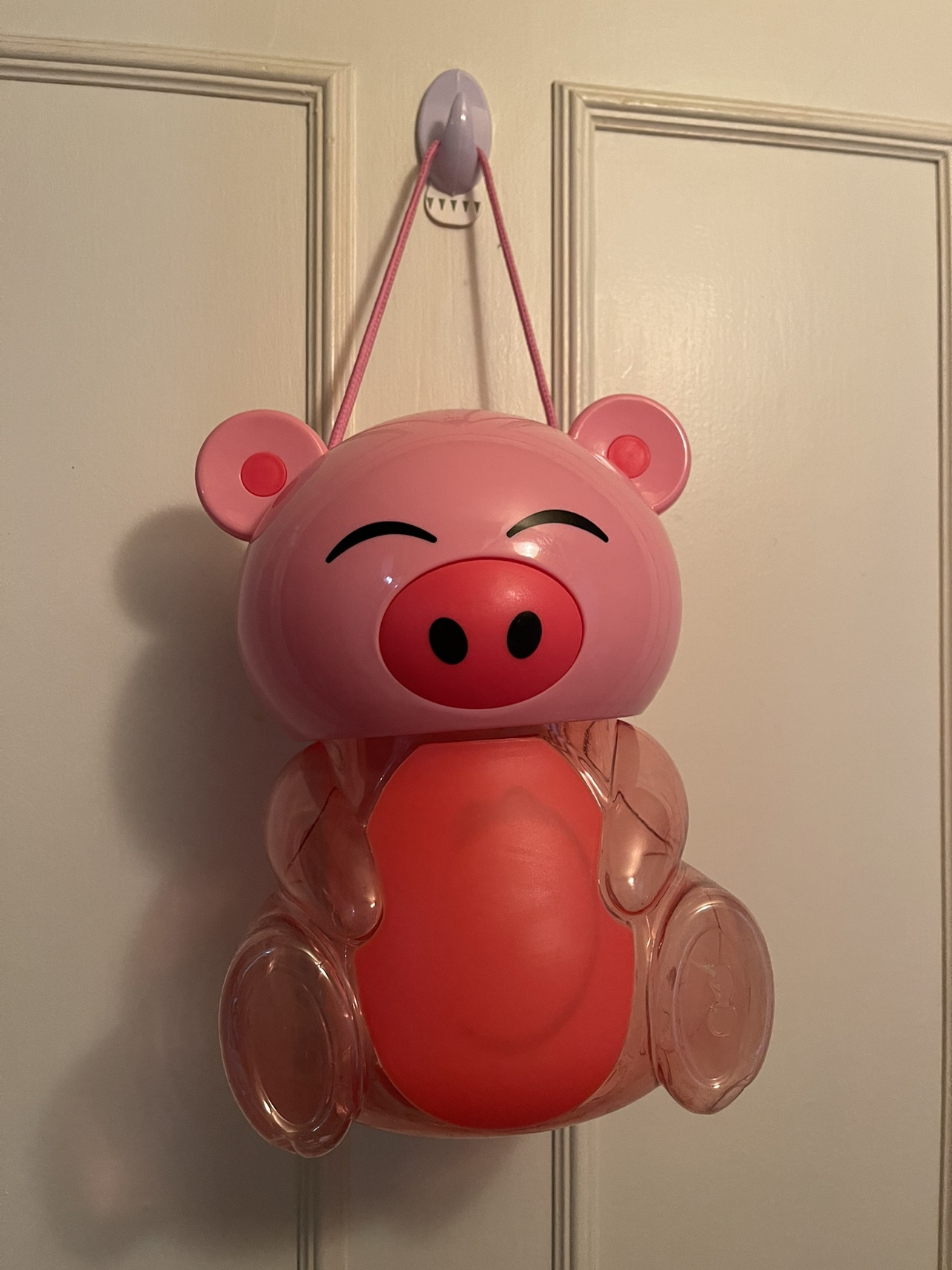 Too cute to throw away. Plastic container with a coin slot on top of piggy head. Head screws on. Use as a storage in a kids room. It hangs too.