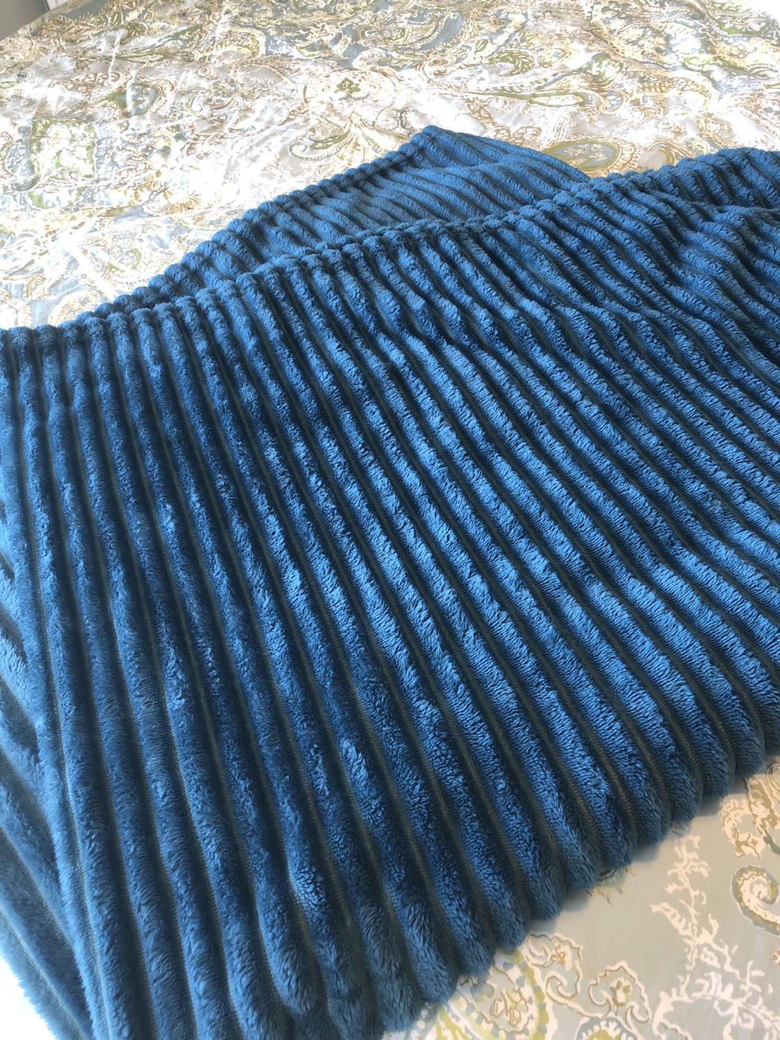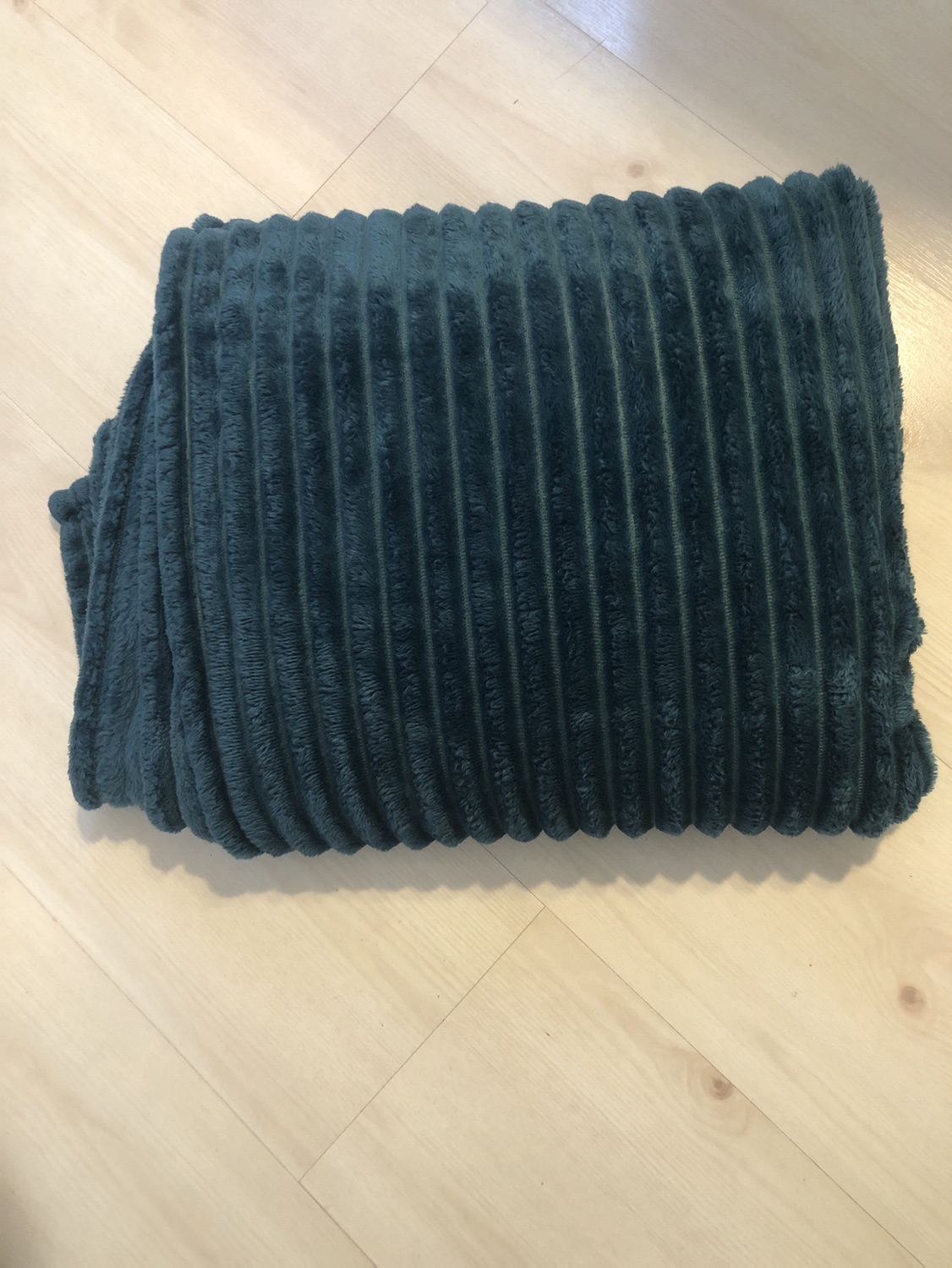Teal fluffy stripped throw blanket. Like new and will be perfect for a bedroom or living room. Final reduction in price