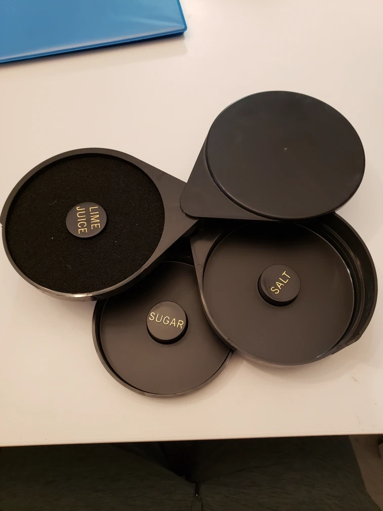 Brand new, never used. Spin-out sections for lime juice, salt, and sugar for rimming cocktail glasses. About 8 inches wide and 3 inches tall. Pick up in south Ajax.