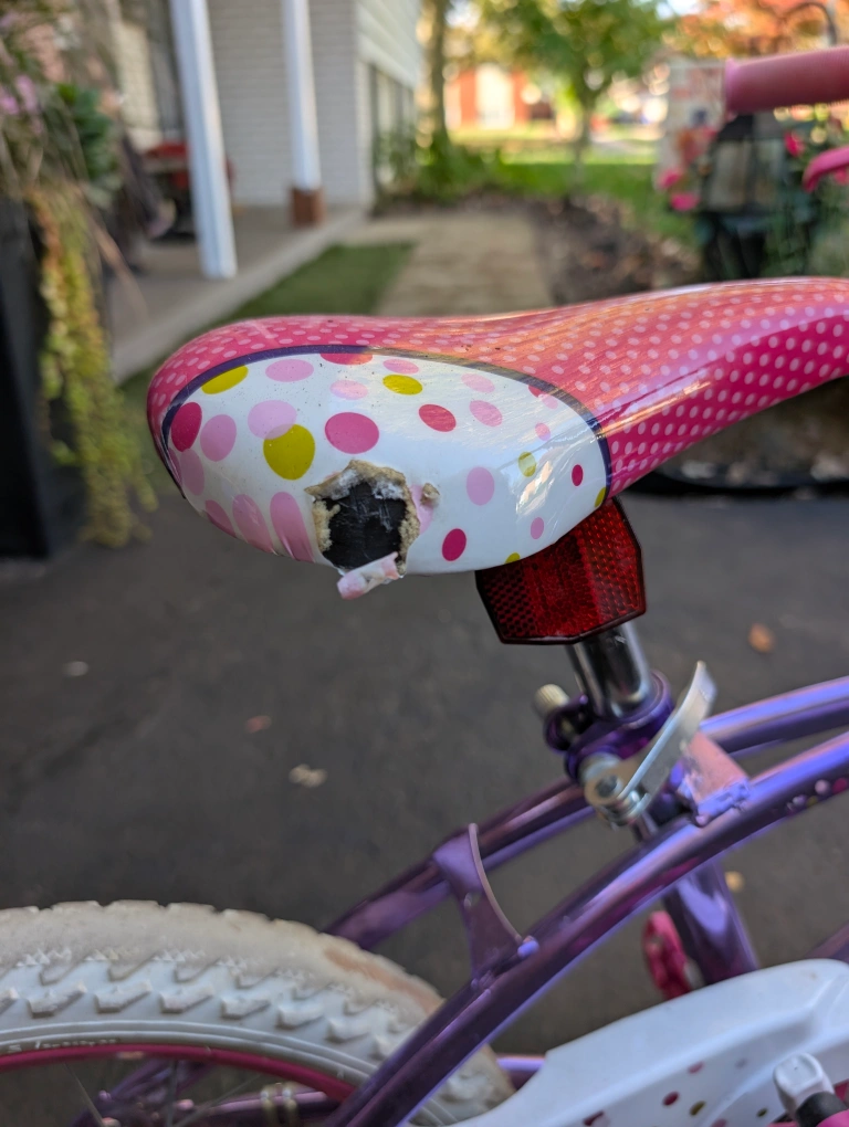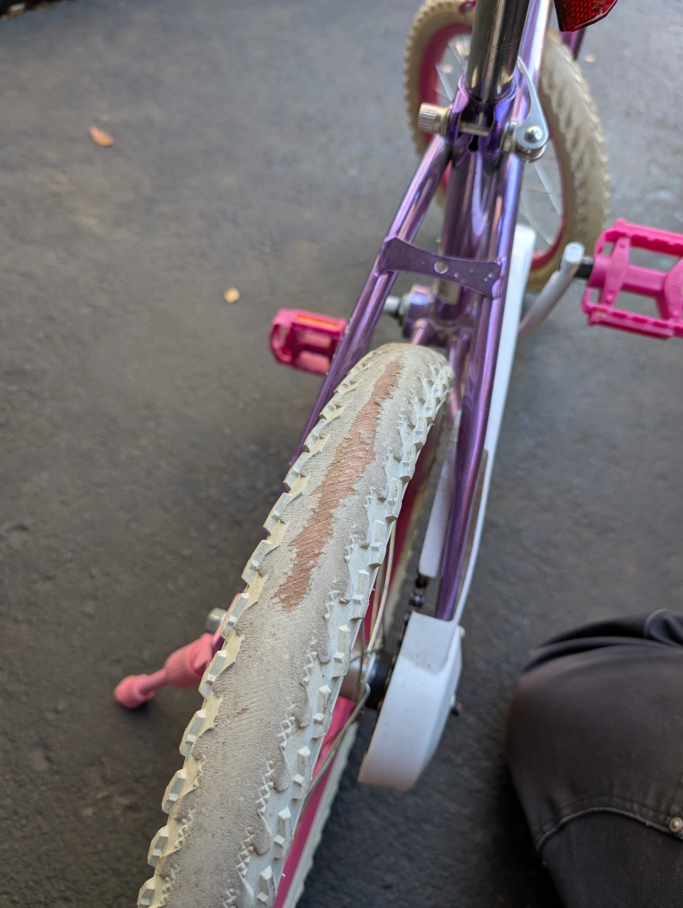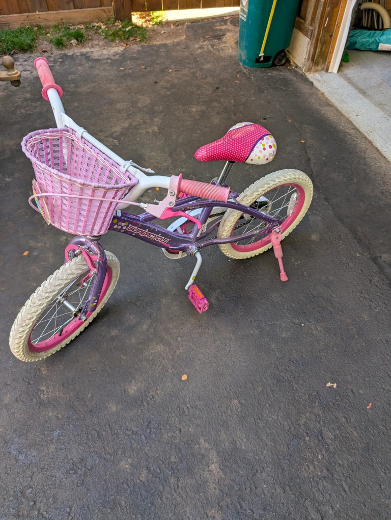 Selling a cute girls' bike in purple and pink! It comes with a basket in the front. Please note that the seat has a tear and the tires show some wear, but it's still perfectly functional for little adventures