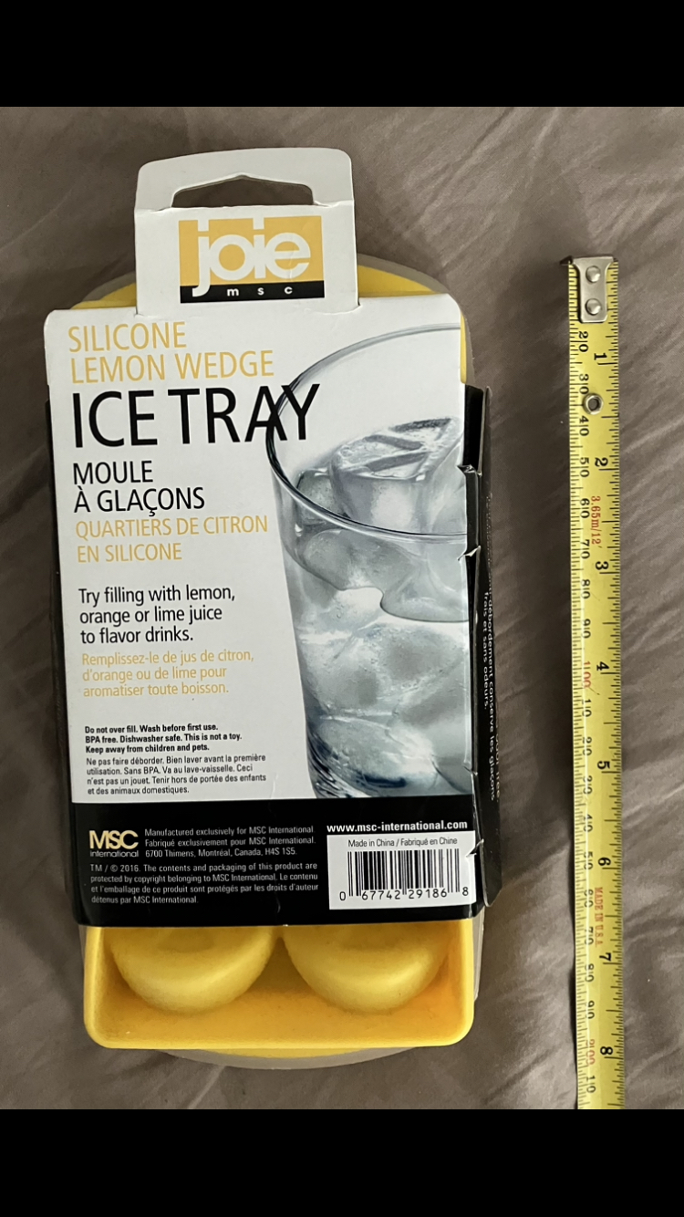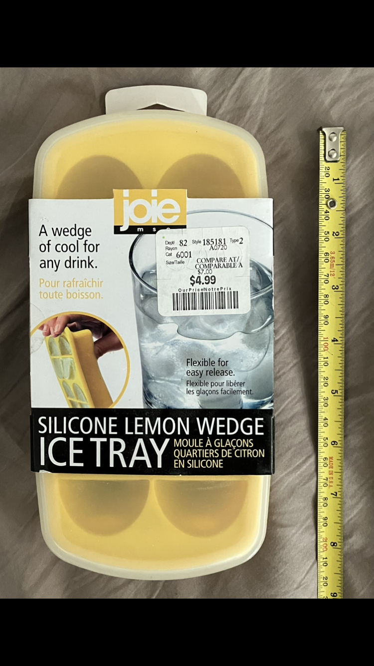 This is my last ice tray I have available. There are no more after this one. I originally bought this one from Homesense for $4.99 + taxes, I’m selling it for only $4, or $3 if you purchase something else! This is a good quality brand and a good size, and it’s new in packaging as shown in photos. BPA free, dishwasher safe. 🍹 This one is a summery yellow silicone tray with lid, and it makes cute lemon 🍋 wedge shaped ice cubes! In a way I don’t really want to sell it, it’s cute, but it’s here available if someone happens to want it. it’s ok though, I’m learning to let go 😋