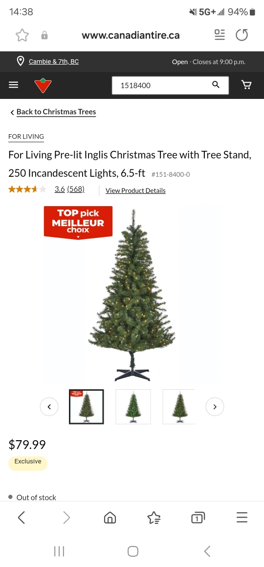 $20.00 is the lowest it's going to get. If it's not gone by Sunday it goes to the recycling! LAST CHANCE TO GET IT. I have a 1pm deadline. Am even willing to deliver it within a few kms. This tree was used once, was up for less than 48 hours then taken down & put back in the box. My housemate brought it, put it up, my partner came home didn't like it so it was down. Brought Christmas Eve from Canadian Tire, was put up by 10pm it was back in the box by 3pm Boxing Day night. Size, full description & pics as per Canadian Tires website. Website says none in stock at Cambie which is where this one was from. Get in early and avoid the rush for a brand new tree.