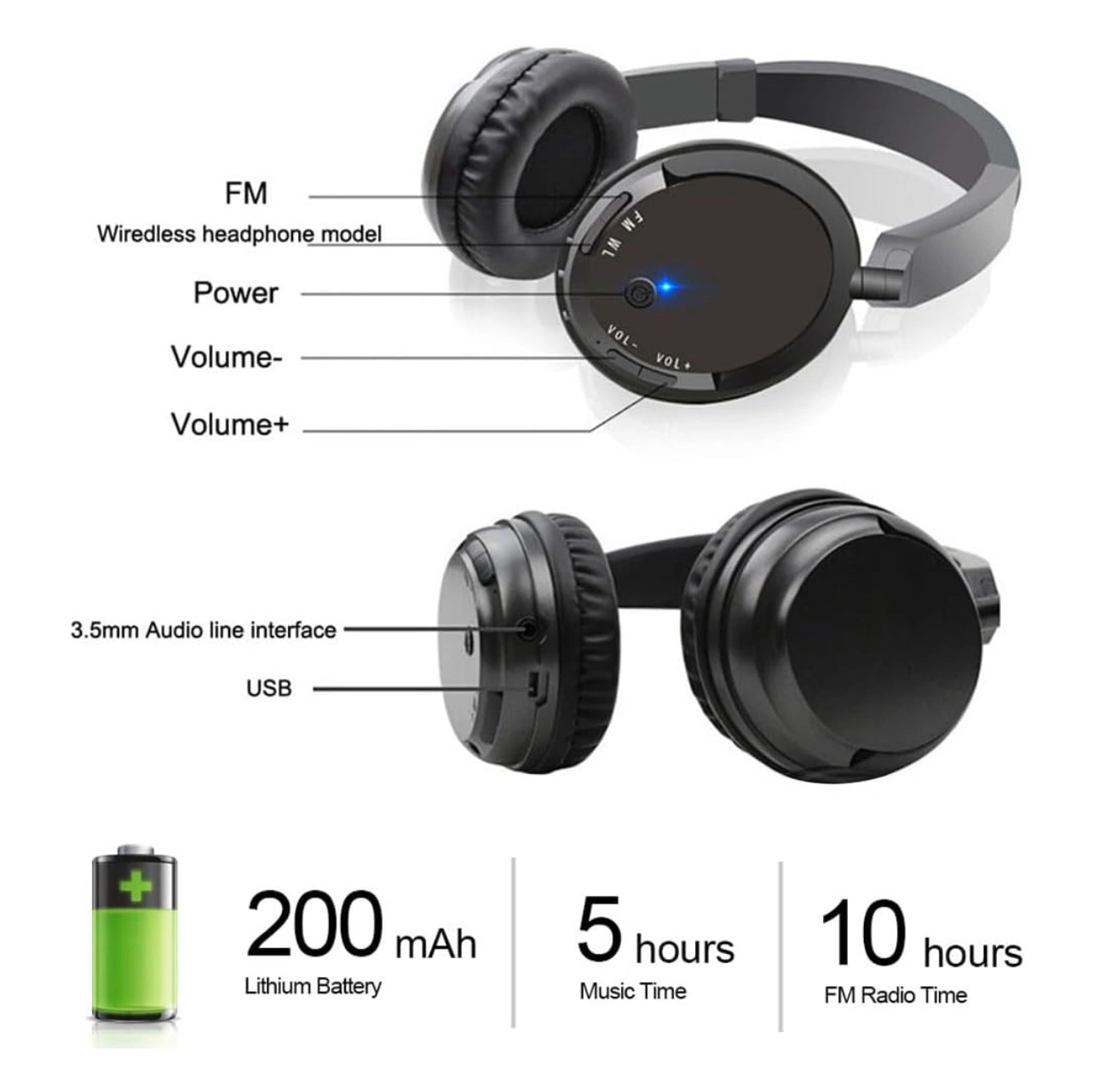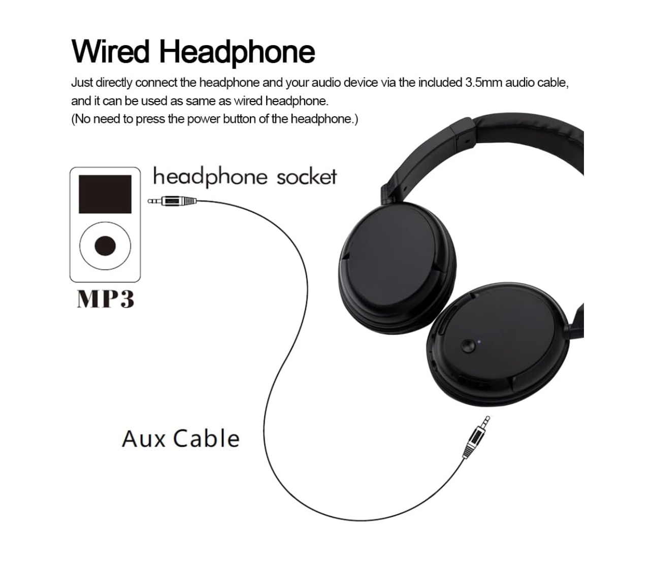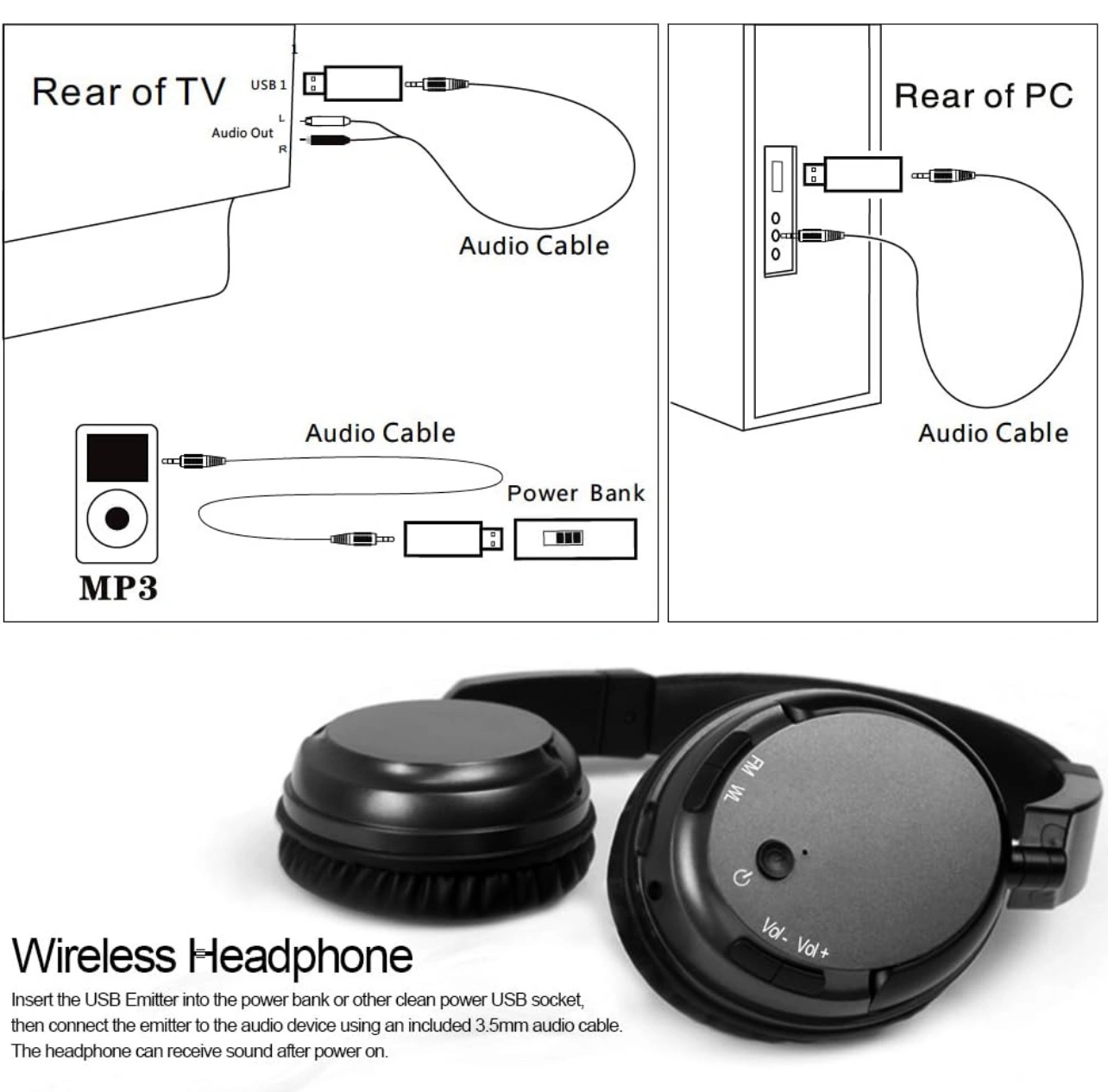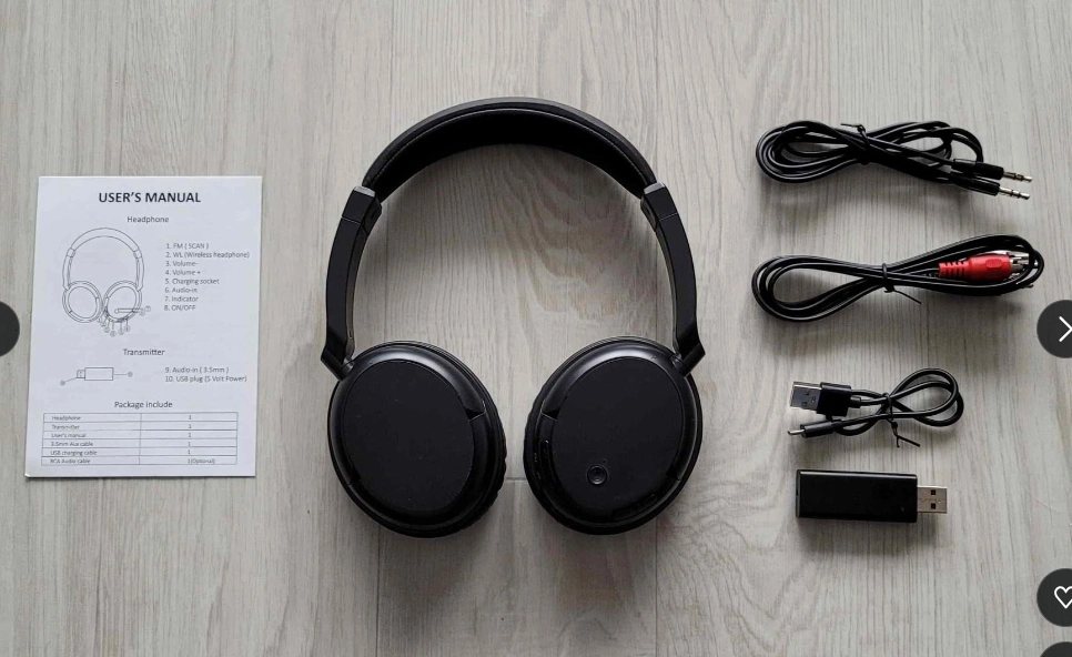 https://www.amazon.ca/gp/product/B0CTHKWBH9/ Condition: new in box Package includes: - 1x headphones (with 3.5mm port) - 1x 3.5mm to 3.5mm AUX cable - 1x 3.5mm to 2-male RCA cable - 1x wireless emitter (3.5mm port to USB) - 1x microUSB charging cable Usage: - Wired headphones (with AUX cable) - Wireless headphones for TV (with RCA cable + emitter) - Wireless headphones for mp3/computer (with AUX cable + emitter) - FM radio (built-in, no cables needed) PLEASE NOTE: These are wireless headphones with USB adapter/emitter, NOT Bluetooth