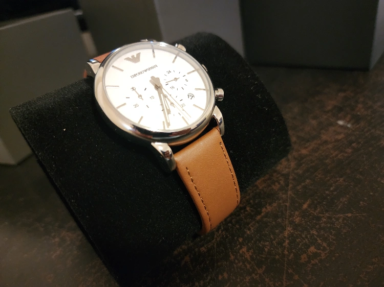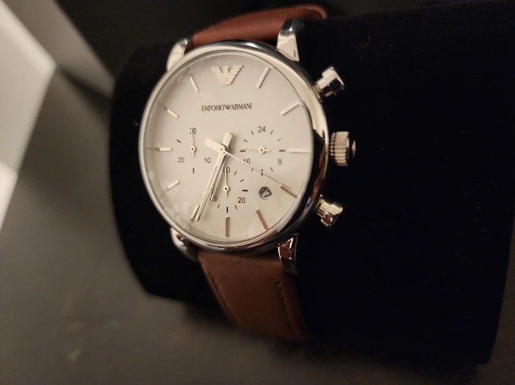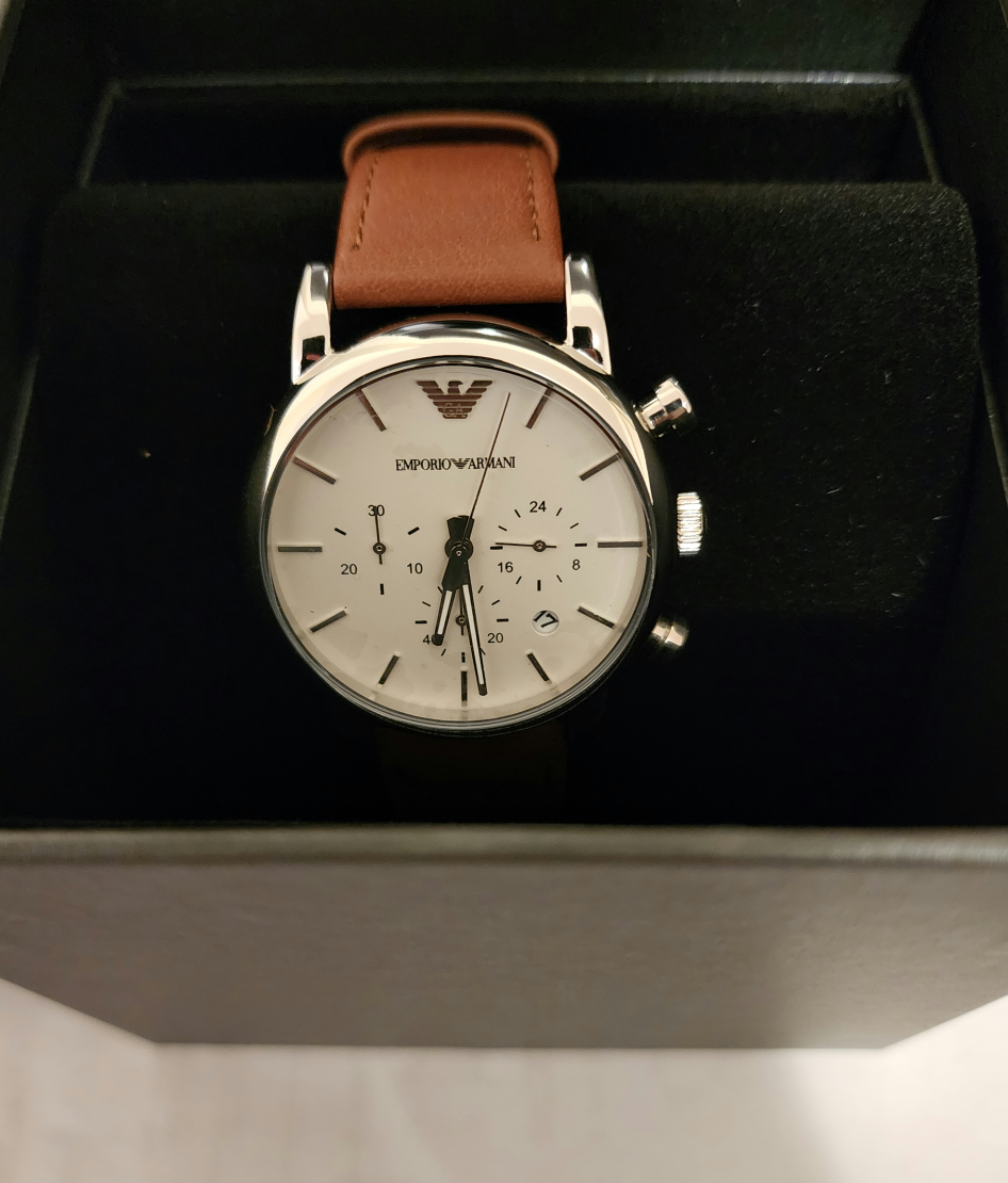 BRAND NEW MODEL NO. AR1846 Case Size: 41 mm Movement: Quartz Chronograph Strap Material: Leather Strap Colour: Brown