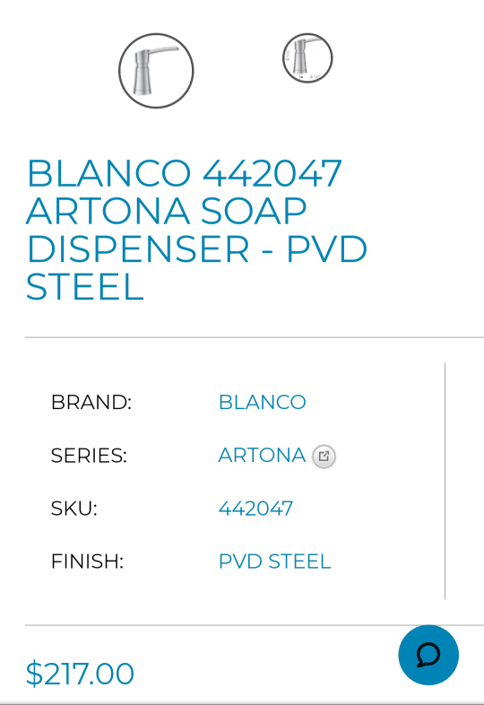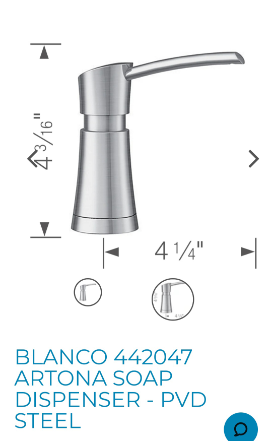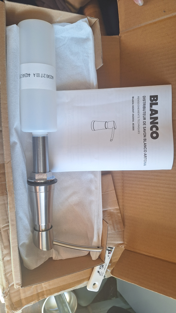 BLANCO 442047 ARTONA SOAP DISPENSER - PVD STEEL Complete the look of your sink area by adding a matching soap dispenser, like the new BLANCO ARTONA soap dispeser. Made of solid brass construction for exceptional durability, these soap dispensers can dispense liquid dish soap, hand soap, and even hand lotion. Our collection of soap dispensers never clog or drip. Plus, they’re specially treated to protect against discolouration and corrosion. This stunning soap dispenser perfectly complements the BLANCO ARTONA faucet collection. VERSATILE OPERATION: Suitable for either liquid dish or hand soap HIGHLY DURABLE: Solid brass construction is strong and long lasting against rust and corrosion TRUSTED QUALITY: All BLANCO soap dispensers are supported by a One Year Limited Warranty EASY-TO-REFILL: Refillable from above the counter and holds approximately 12.5 fl oz. of liquid or dish soap SOAP CAPACITY: 12.5 fl oz. (370 ml) bottle capacity – to prevent clogging dilute 70/30 soap to water EASY-TO-INSTALL: Requires a 1-3/8” diameter drilled hole and can be installed in minutes condition brand new Danforth and Eglington Pick up only