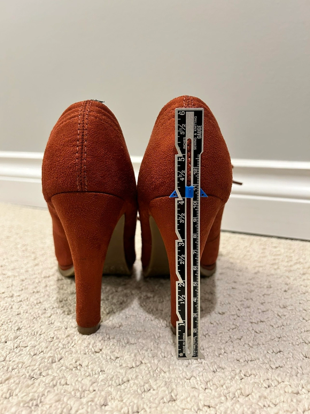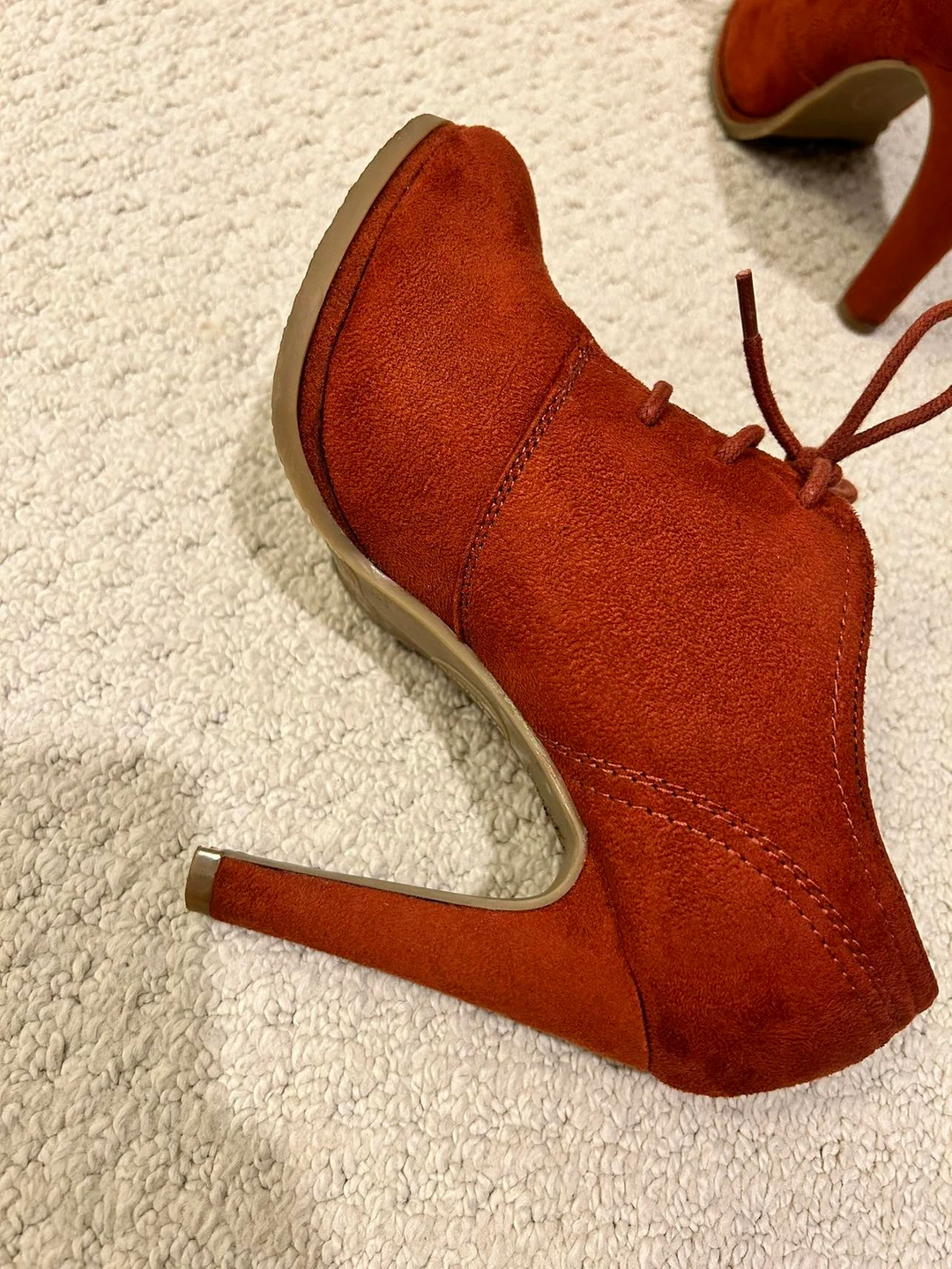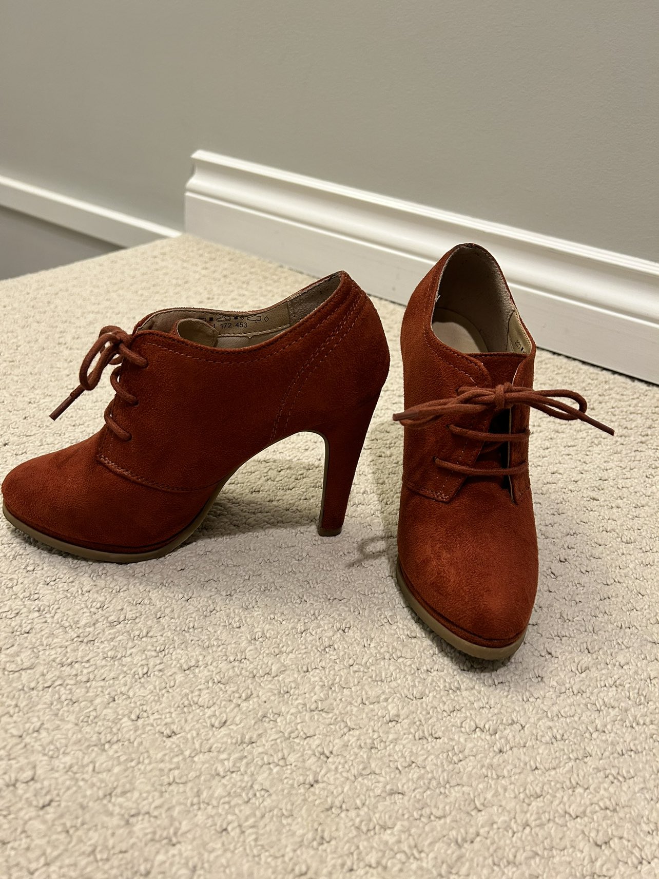 Orange high Heel laced shoes Suede feel, rubber soles Size 36 Like new, only selling because they fit small on me. Originally purchased in Switzerland ๐จ๐ญ Pick up near Richmond Centre