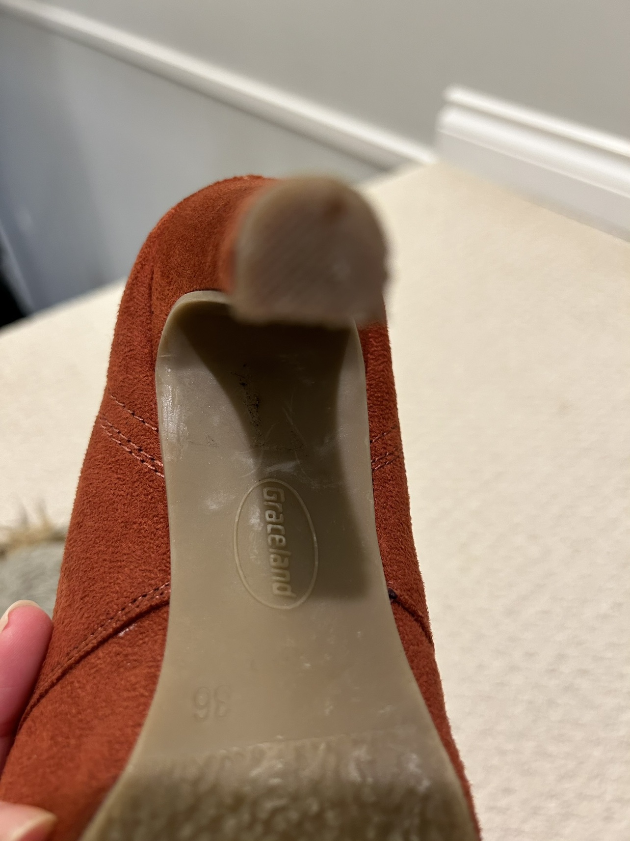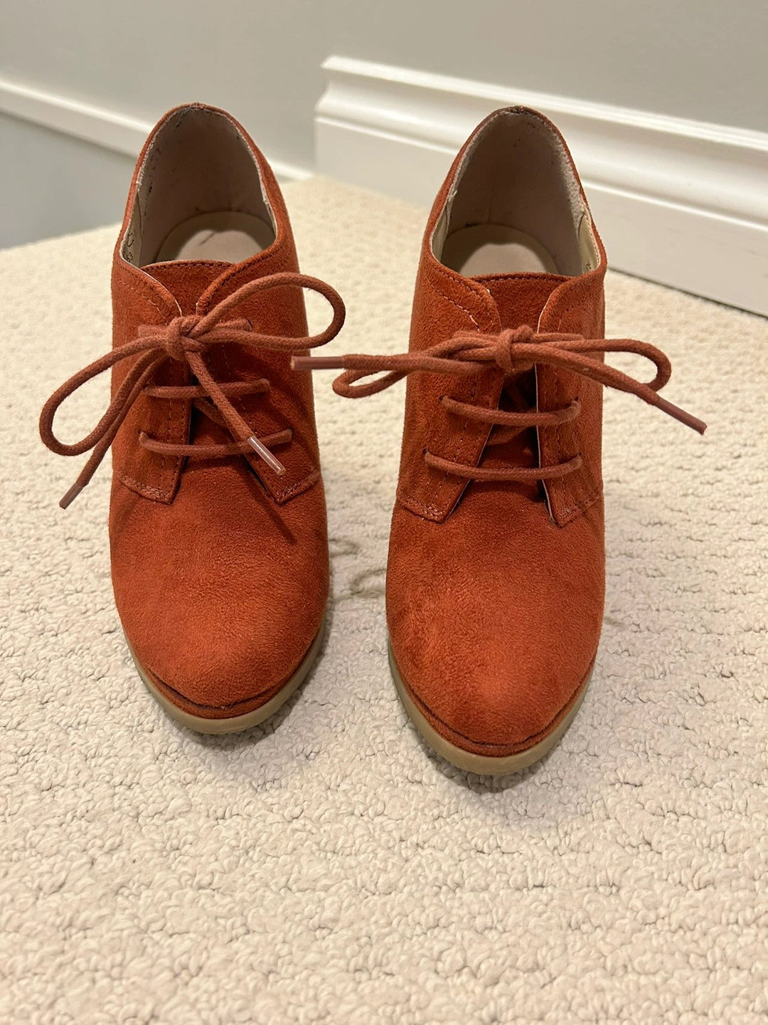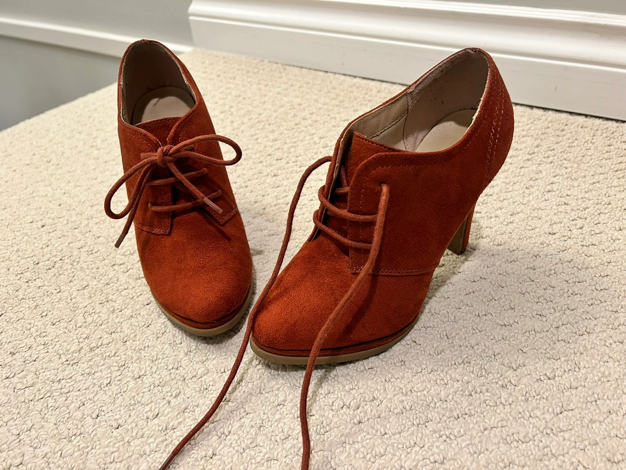 Orange high Heel laced shoes Suede feel, rubber soles Size 36 Like new, only selling because they fit small on me. Originally purchased in Switzerland ๐จ๐ญ Pick up near Richmond Centre