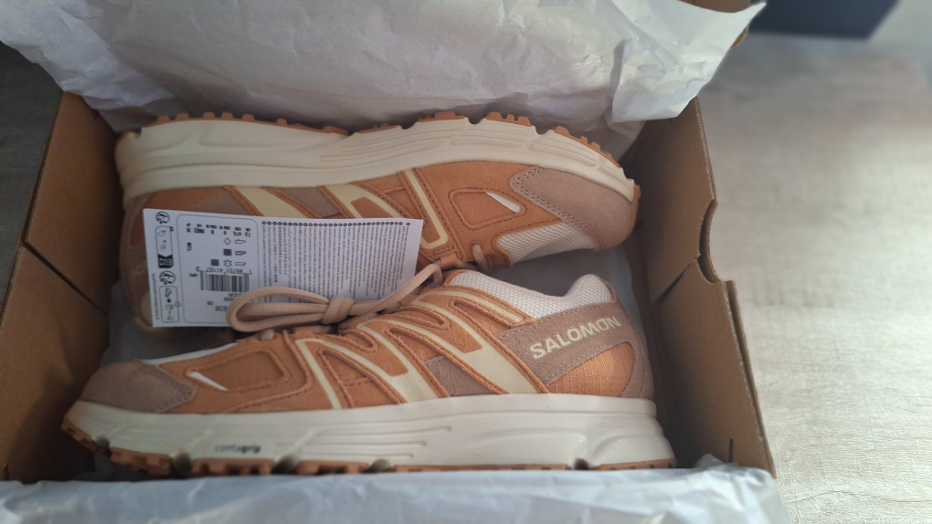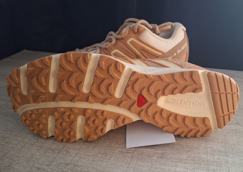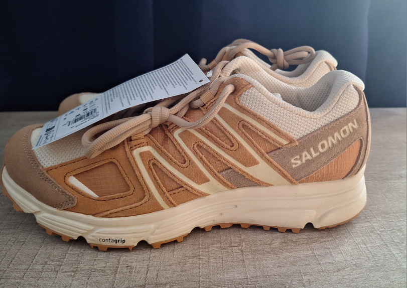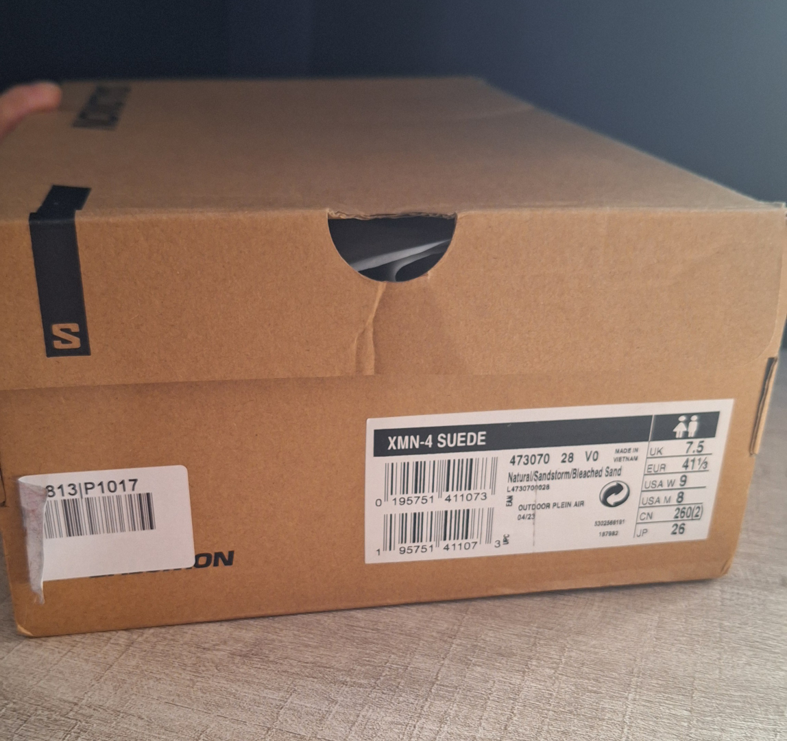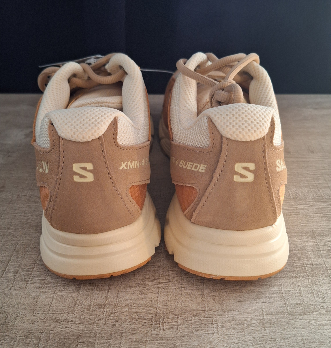 Salomon XMN-4 Suede Sneaker Suede and mesh upper with Contragrip® rubber sole Made in Vietnam Lace-up front Padded collar and tongue Side Salomon logo Our Style No. SMOF-MZ77 size 8 condition brand new Danforth and Eglington Pick up only