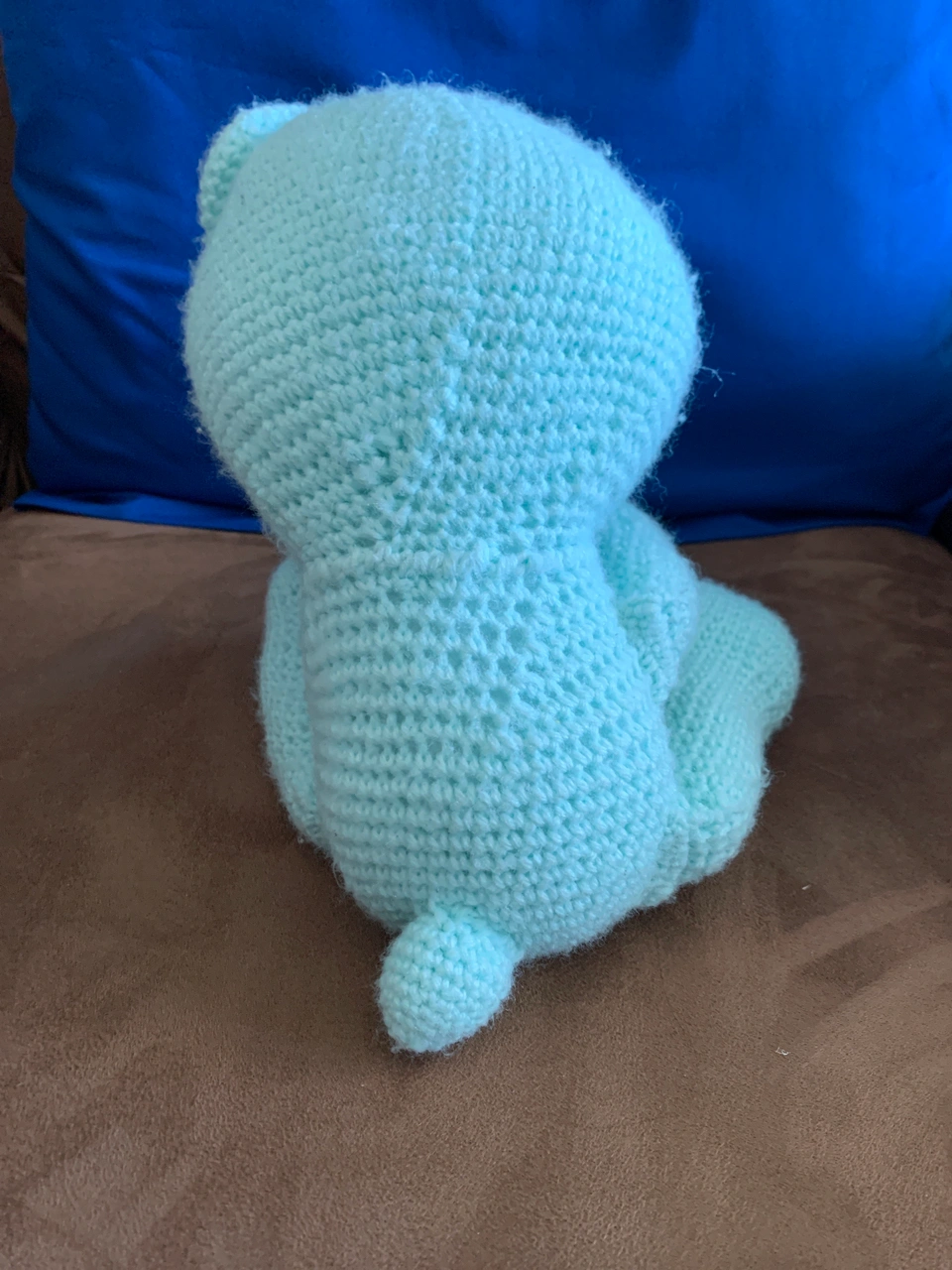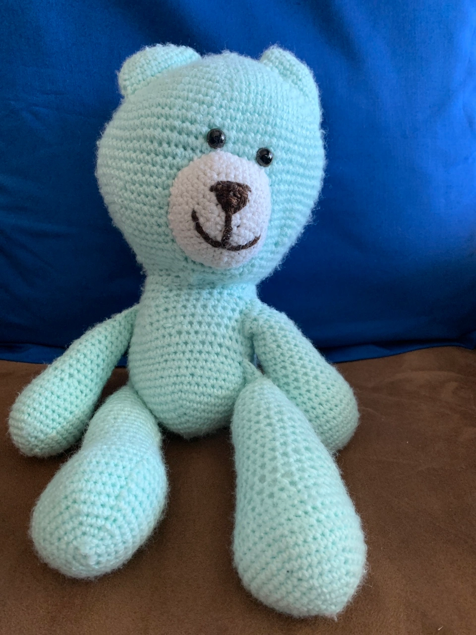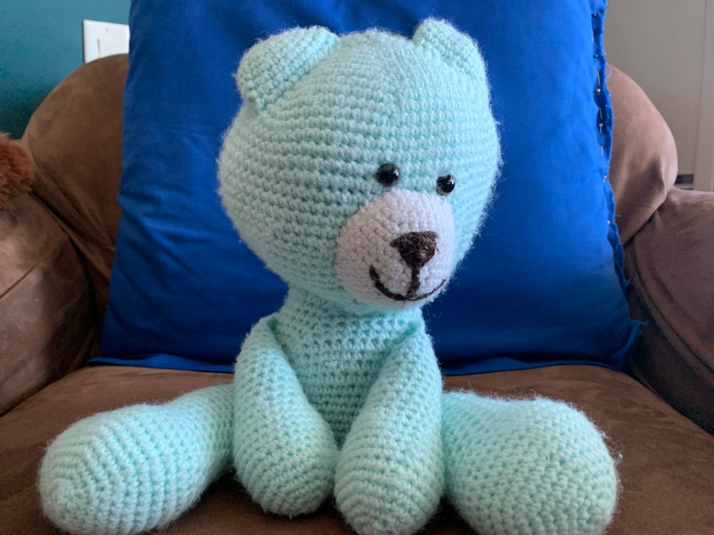 Mint green crocheted teddy in great shape looking for someone to love. My ex’s cousin or cousin’s friend (I can’t remember which) gave this to me for my 40th birthday, and it has either just lived inside a trunk of memorabilia or sat on my bed or a bench by the window - I think he’d be much happier being hugged every day by someone who loves him, though 🥰 He’s been kept in a pet-free, smoke-free, fragrance-free home this whole time. I could maybe give him a gentle hand wash using unscented Soak wool detergent then let him air dry too, if you like (just let me know!). Oh - and the beaded eyes seem pretty solidly attached, but could be a choking hazard to littler friends if they ever came loose, I think. I’ll accept e-transfer, cash (in-person only, and only for the agreed-upon price), or PayPal (I’ll accept g&s if you pay the fee).