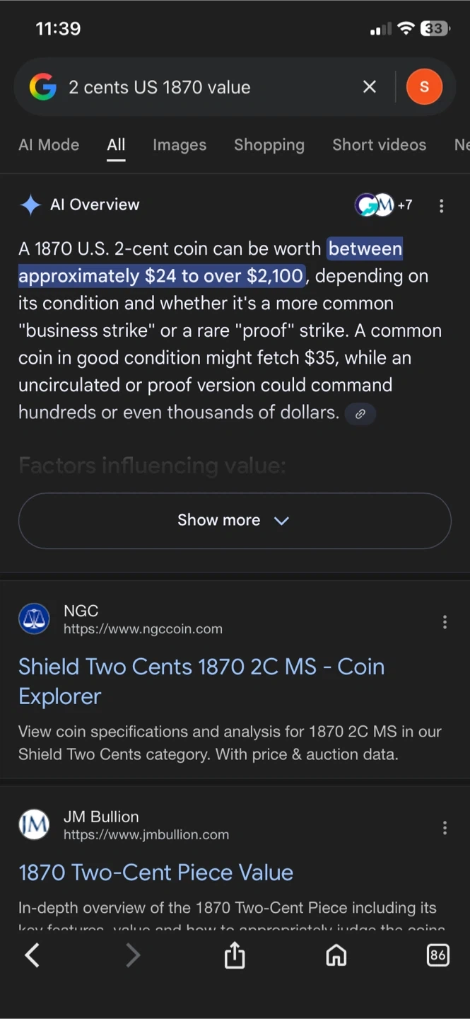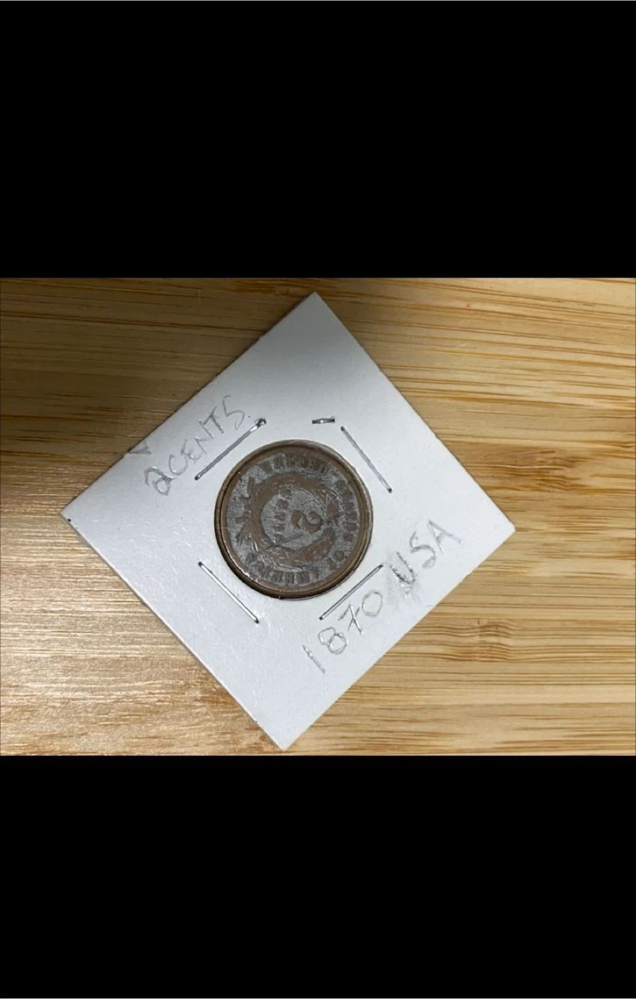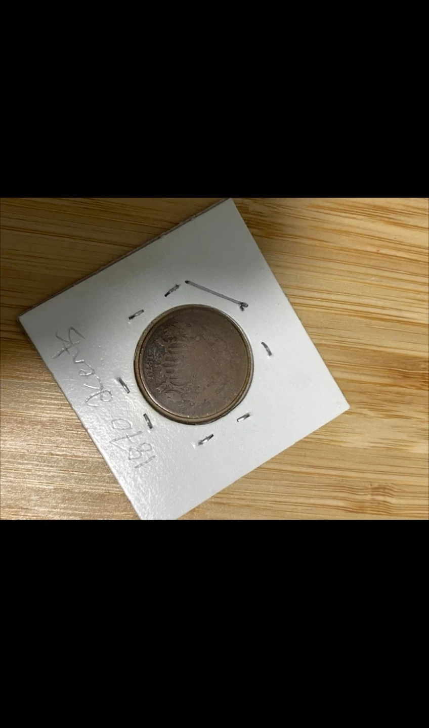 Type: Two-Cent Coin Country: United States of America Year: 1870 Composition: 95% Copper, 5% Tin and Zinc (Bronze) Weight: 6.22 grams Diameter: 23.0 mm Thickness: ~1.7 mm Edge: Plain (smooth) Designer: James B. Longacre Mint: Philadelphia (no mint mark) Mintage: 861,250 pieces ⸻ 💰 Design Details Obverse (Front): • Features a shield with a ribbon inscribed “IN GOD WE TRUST” above it — this was actually the first U.S. coin to carry that motto. • The date 1870 appears below the shield. Reverse (Back): • Displays a large “2” centered, surrounded by a wheat wreath. • The inscription “UNITED STATES OF AMERICA” encircles the edge.