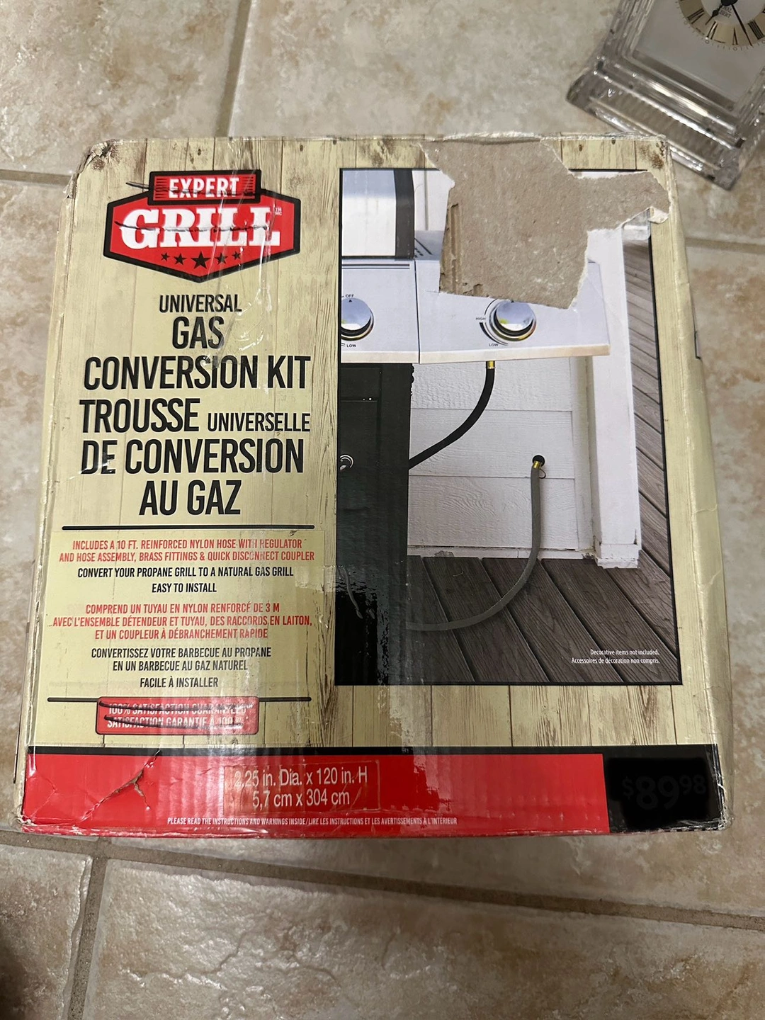 Mississauga, Expert Grill Universal Gas Conversion Kit, Easy to Install $80 • Includes a 10 ft. reinforced nylon hose with regulator and hose assembly, brass fittings, and quick disconnect decoupler • Converts your propane grill to a natural gas grill •Easy to install •6 mm wrench, nut driver, hex key •NATURAL GAS ORIFICES NOT INCLUDED WITH THIS KIT