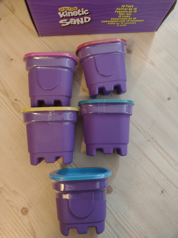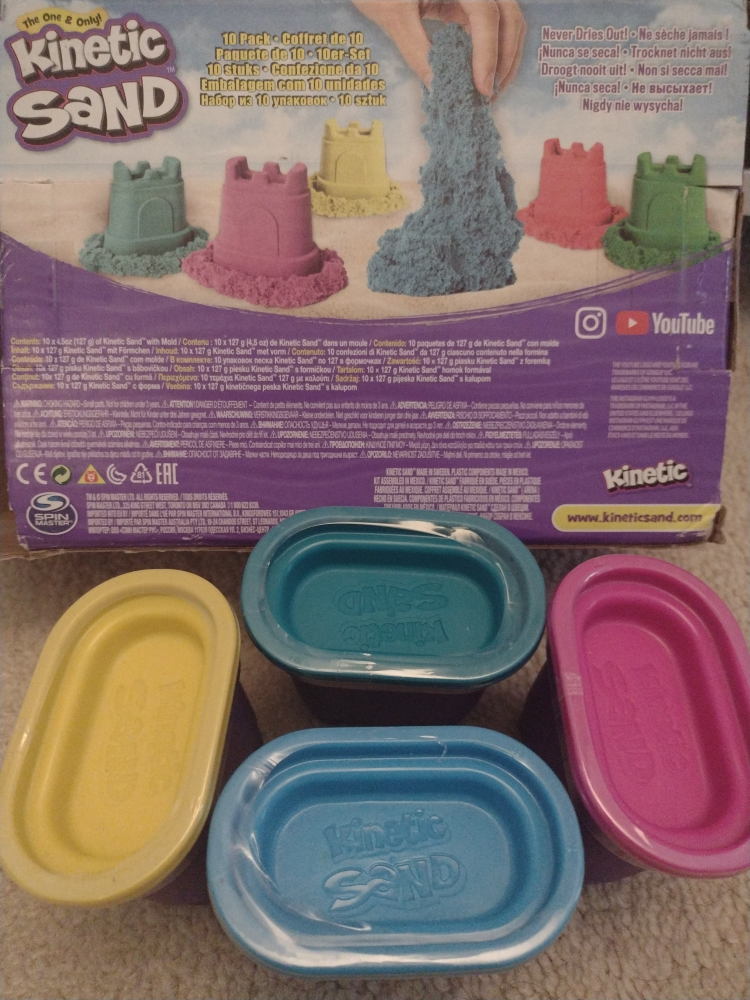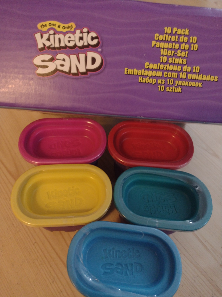 The one and Only Kinetic sand for kids Various colors from a previous 10 pack 10 pack on Amazon costs $20-30+taxes Selling 4 for $4.00 or 1$ each so not bad of a deal. they are all still fully sealed updated 4 colors on 3rd pic Kinetic Sand, Castle Containers 10-Color Pack Colored Sand for Party Favors, Goodie Bags, Sensory Toys for Kids Aged 3 and up https://a.co/d/3EpEDrJ