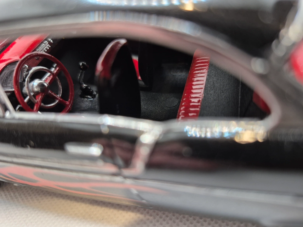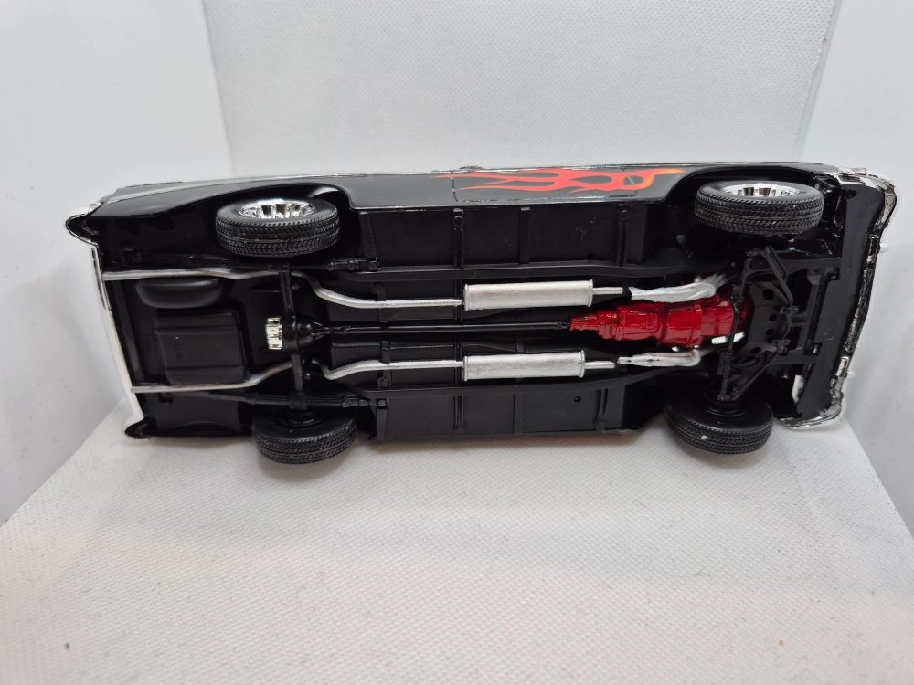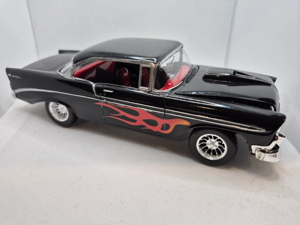 Selling a plastic model of a 1956 Chevy Bel Air. It's black with red interior and flame decals on the side. The hood opens to reveal the engine. A great addition to any collection!