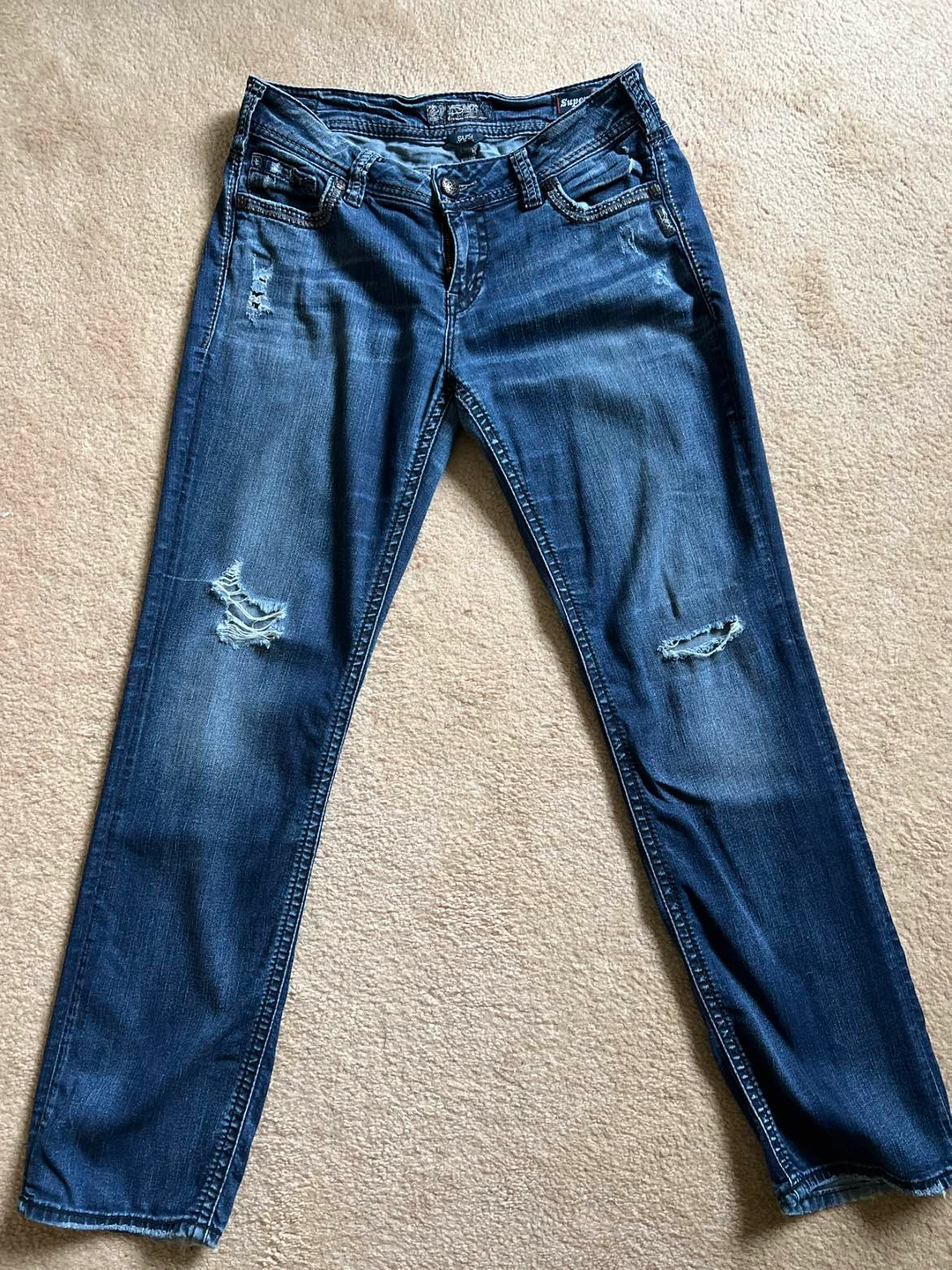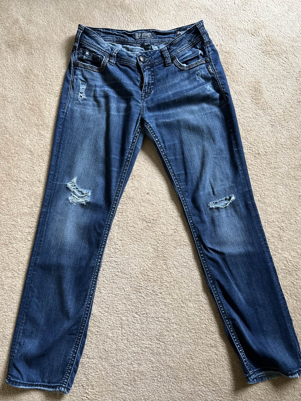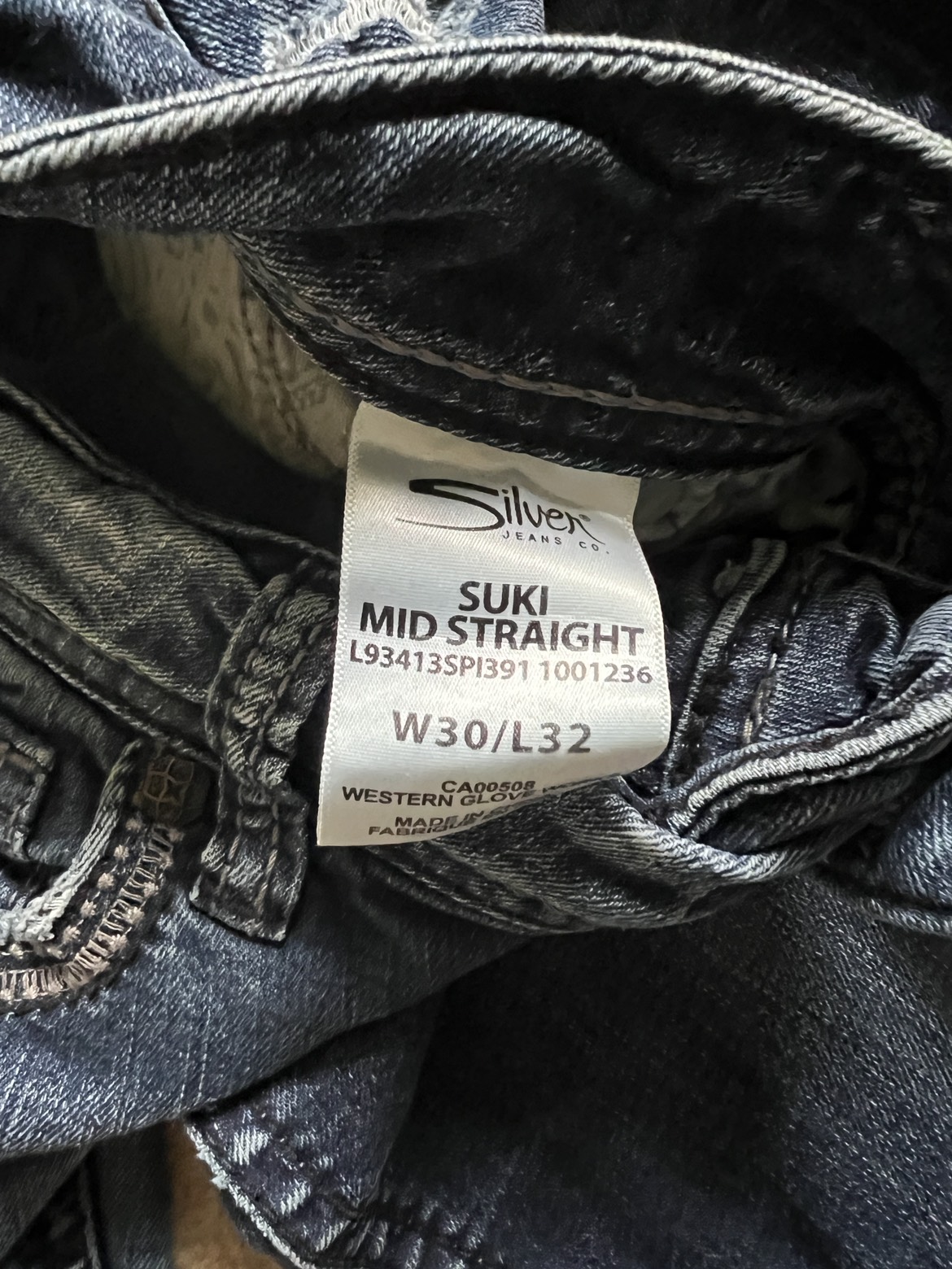 Silver Suki Mid Straight Jeans W 30 L 32 Distressed 83% Cotton 16% Polyester 1% Elastane 13” raise Smoke free home Always been hung dry
