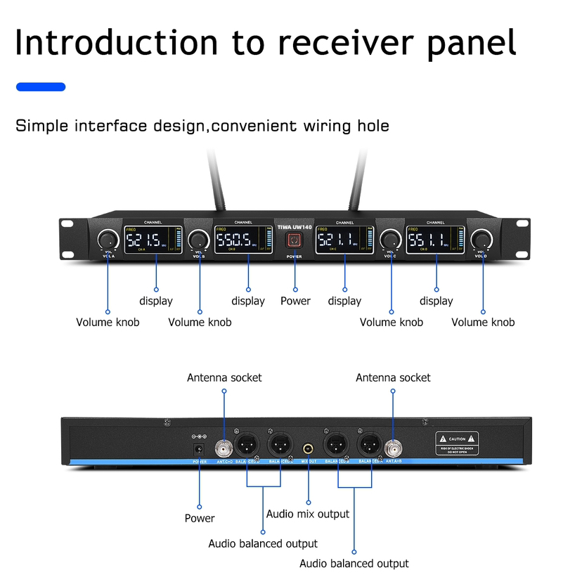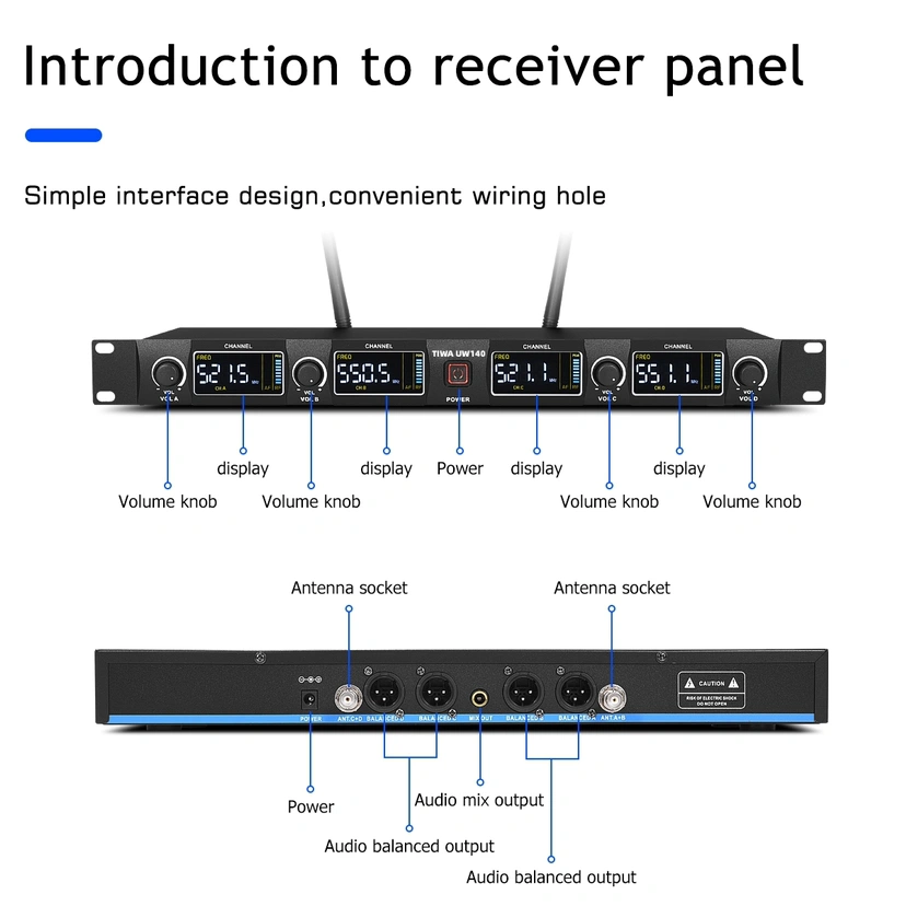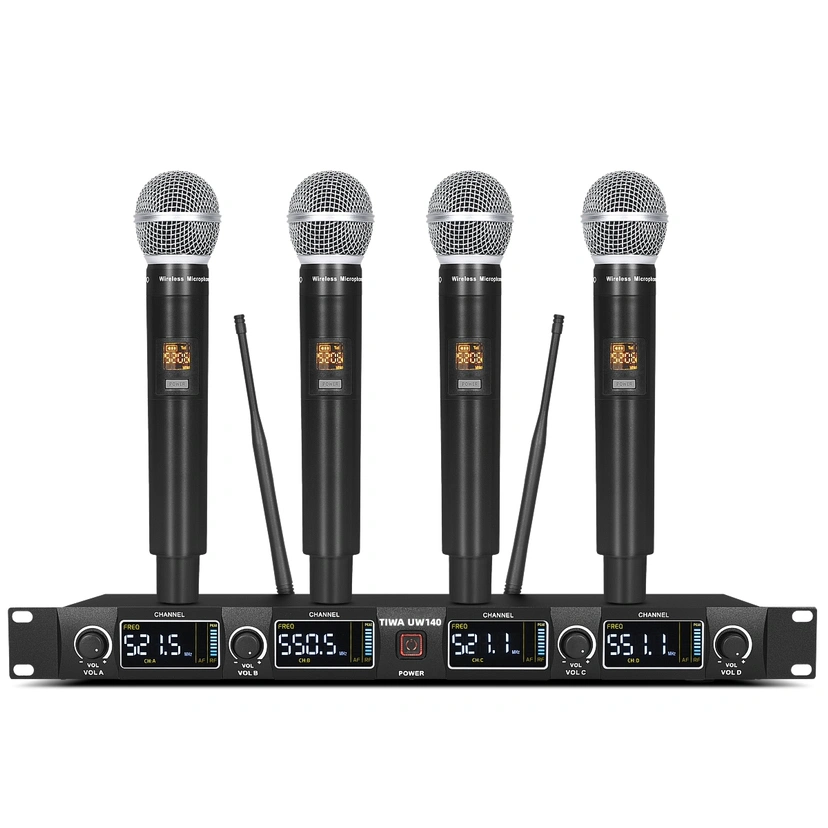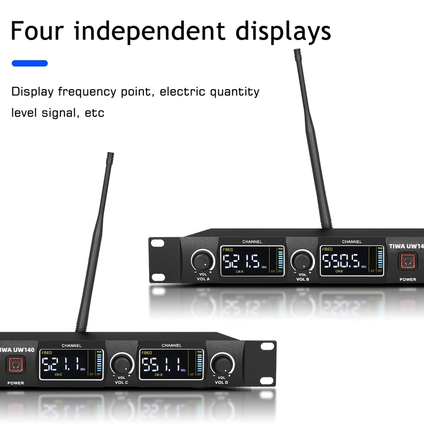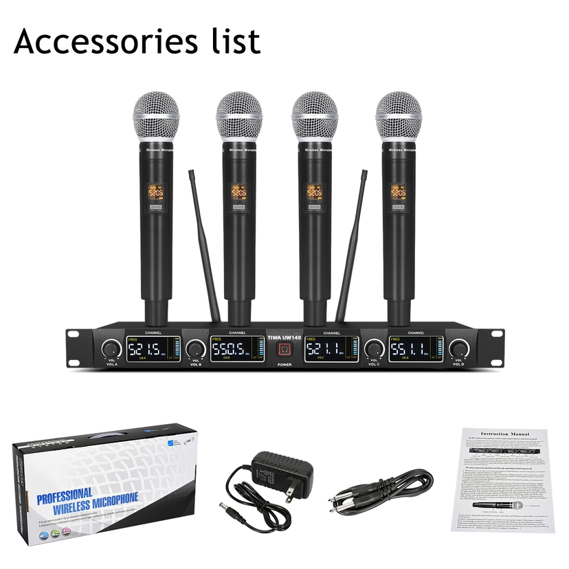 Wireless microphone system with 4 handheld brand new LONG DISTANCE:Up to 300ft long range in wide open space line of sight.Upgraded wireless signal acquisition,2 antennas installed on the back of the receiver to enhance the received signal, ensuring high frequency stability and accuracy. UHF Microphone System: UHF adjustable high frequency circuit design, easy to avoid interference frequencies. Provides clear, solid, best true sound. Frequency adjustable: The four-channel wireless microphone system presets a total of 120 channels divided into 4 groups, each group has 30 channels, you can choose the appropriate channel/frequency in some interference places. In addition, if you want to use multiple machines at the same time, you can also achieve superimposed use by locking the frequency of each machine. High Quality: Both transmitter and receiver metal design, each channel has individual volume control and individual LCD display for precise vocal balance and the precise channel used. WIDE COMPATIBILITY:Four XLR outputs & one 1/4”(6.35mm) mix output to connect this versatile system to most amplifiers/mixers/powered speaker on market.Plug-and-go easy setup.