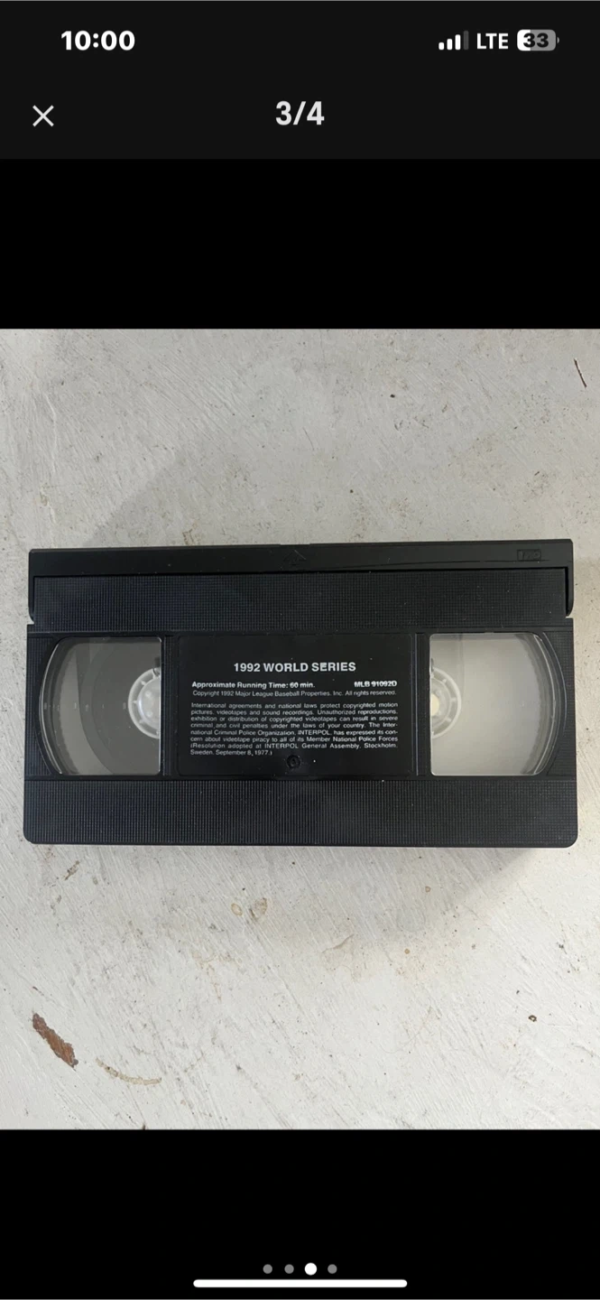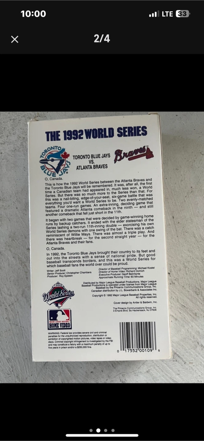 Selling a vintage 1992 World Series VHS tape featuring the Toronto Blue Jays against the Atlanta Braves. A great piece of baseball history to add to your collection!