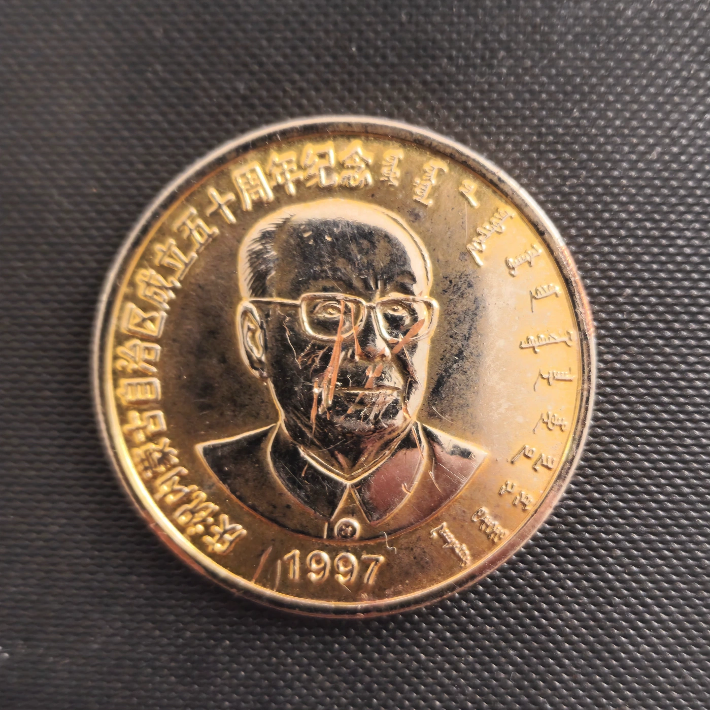 This coin commemorates the 50th Anniversary of the Establishment of the Inner Mongolia Autonomous Region, issued by the People's Republic of China in 1997. The inscription on the coin reads "庆祝内教古自区成立五十周年纪念" (Celebrating the 50th Anniversary of the Establishment of Inner Mongolia Autonomous Region) and features a portrait, likely a prominent figure associated with the region or its establishment.