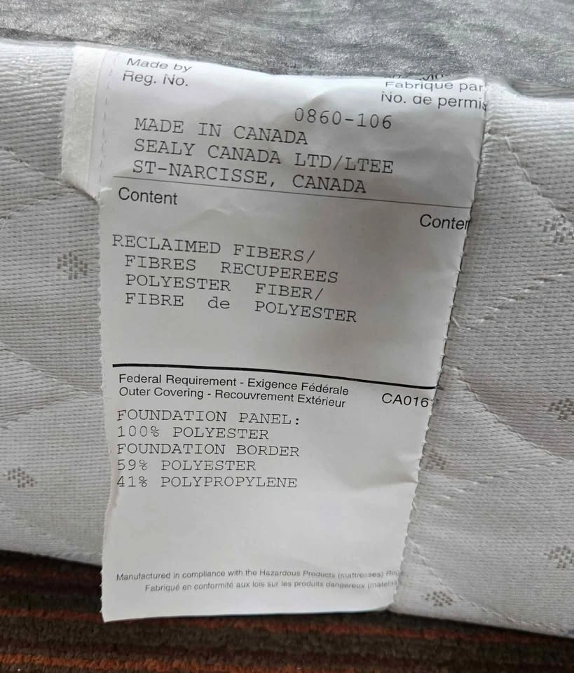 2 Foundation Panel: 100% Polyester Matress in great condition some damage from wear. Reclaimed Fibres / Fibres Recuperates Polyester Fibre / Fibre de Polyester • FOUNDATION PANEL: 100% Polyester FOUNDATION Border 59% Polyester 41% POLYPROPYLENE. Pick up in Exhibition Park on Thursday 12-4 and Sunday 9-3.