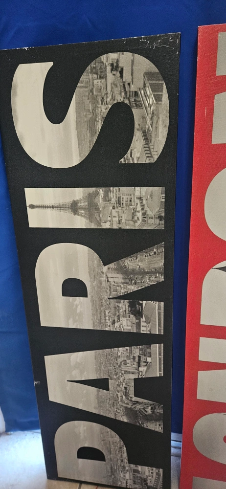 Travel-inspired wall decor! Selling a pair of tall wall hangings with "Paris" and "London" written in large metallic letters. Each piece has detailed photos of famous sights. Pickup area Thornhill woods and Hwy 7