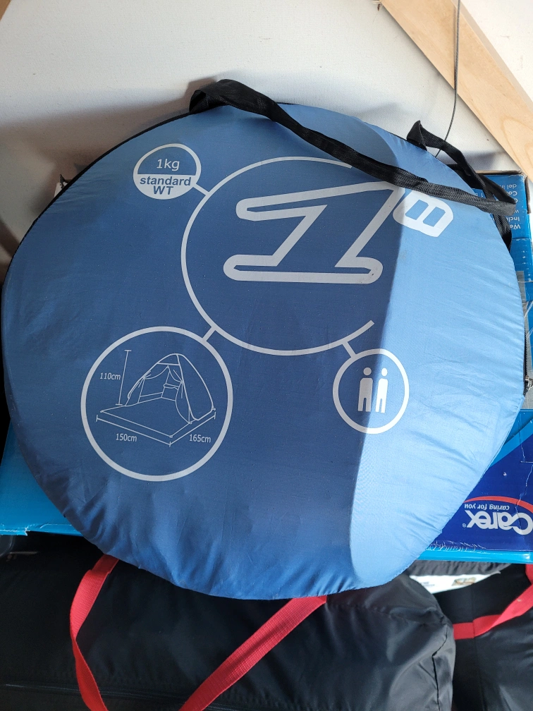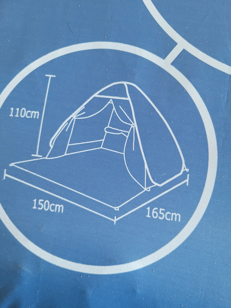 Selling a blue 2-person popup shelter! It's lightweight at just 1 kg and easy to carry. The dimensions are 110cm in height, 150cm in width, and 165cm in length. Perfect for the beach etc