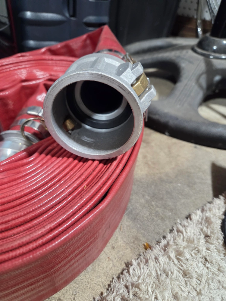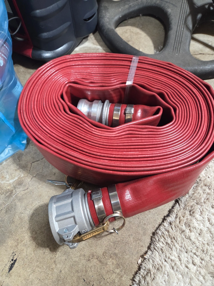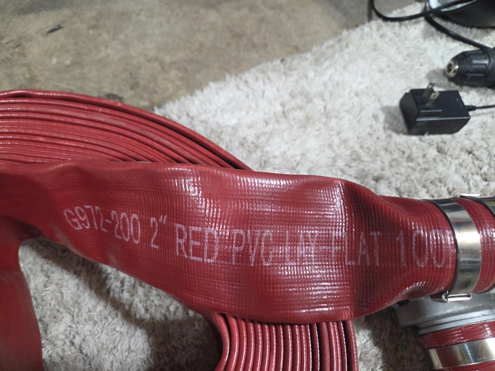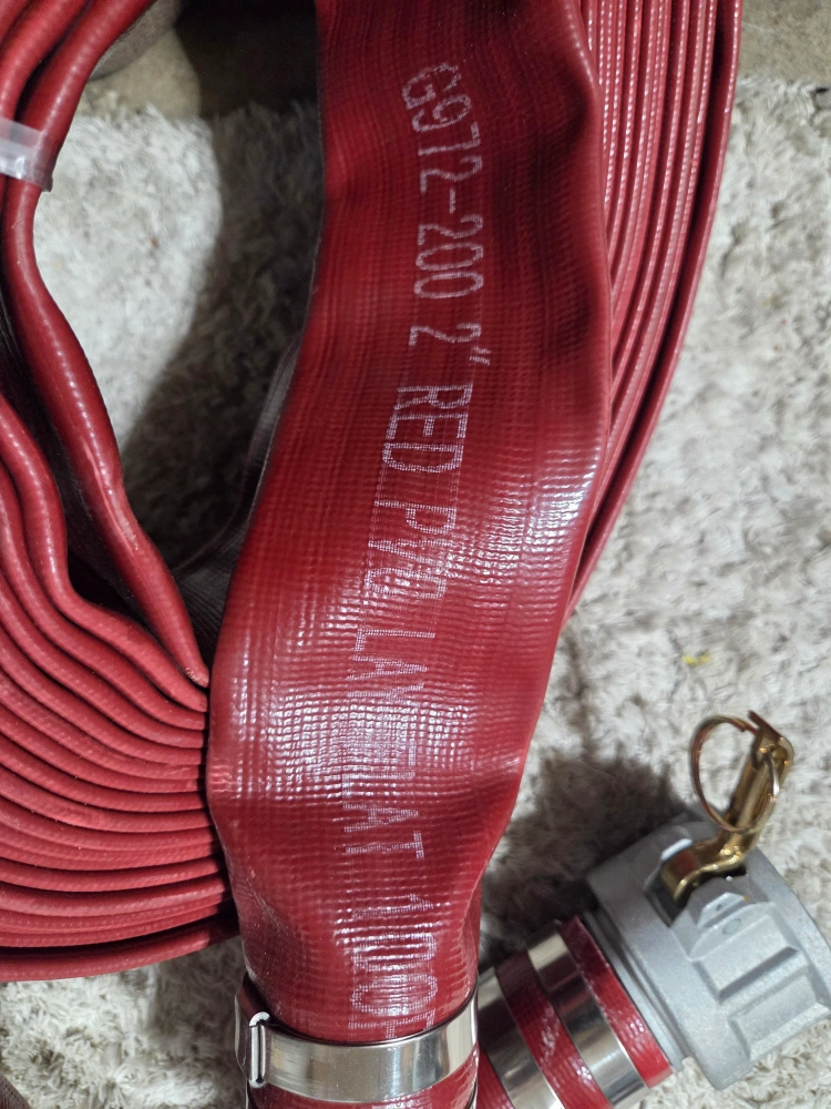 Selling a 2" red PVC hose. It's marked with G972-200. This hose is flat and 100ft long. Perfect for various applications!
