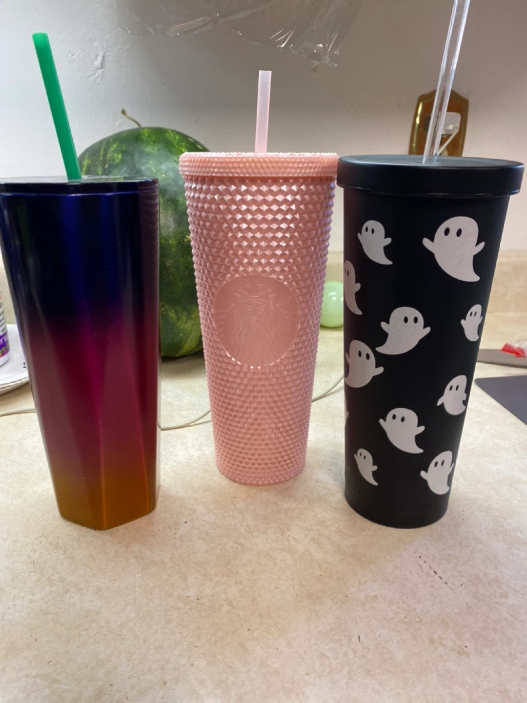 Selling a set of three tumblers,1-Tim’s & 2-Starbucks. Tim says Metal and the ghost glow in the dark . (MINT CONDITION) Purple Starbucks is also metal, pink is plastic. Purple has a chip on the top of the lid, which has no impact on working pink has a crack on the side, which has no impact on working.. Tim’s $15.00 Starbucks $7.00 ea PICK UP PICKERING WHITES RD & STROUDS LANE