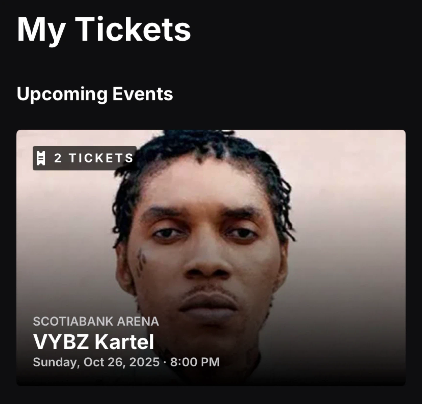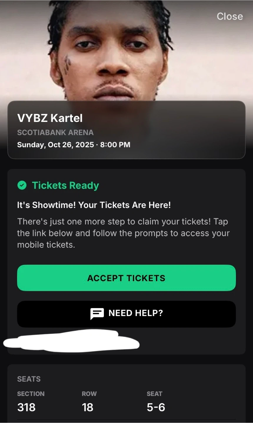Selling two tickets to see Vybz Kartel at Scotiabank Arena on Sunday, October 26, 2025, at 8:00pm. Section 318, Row 18, Seats 5 & 6. Tickets will have to be sent via mobile transfer