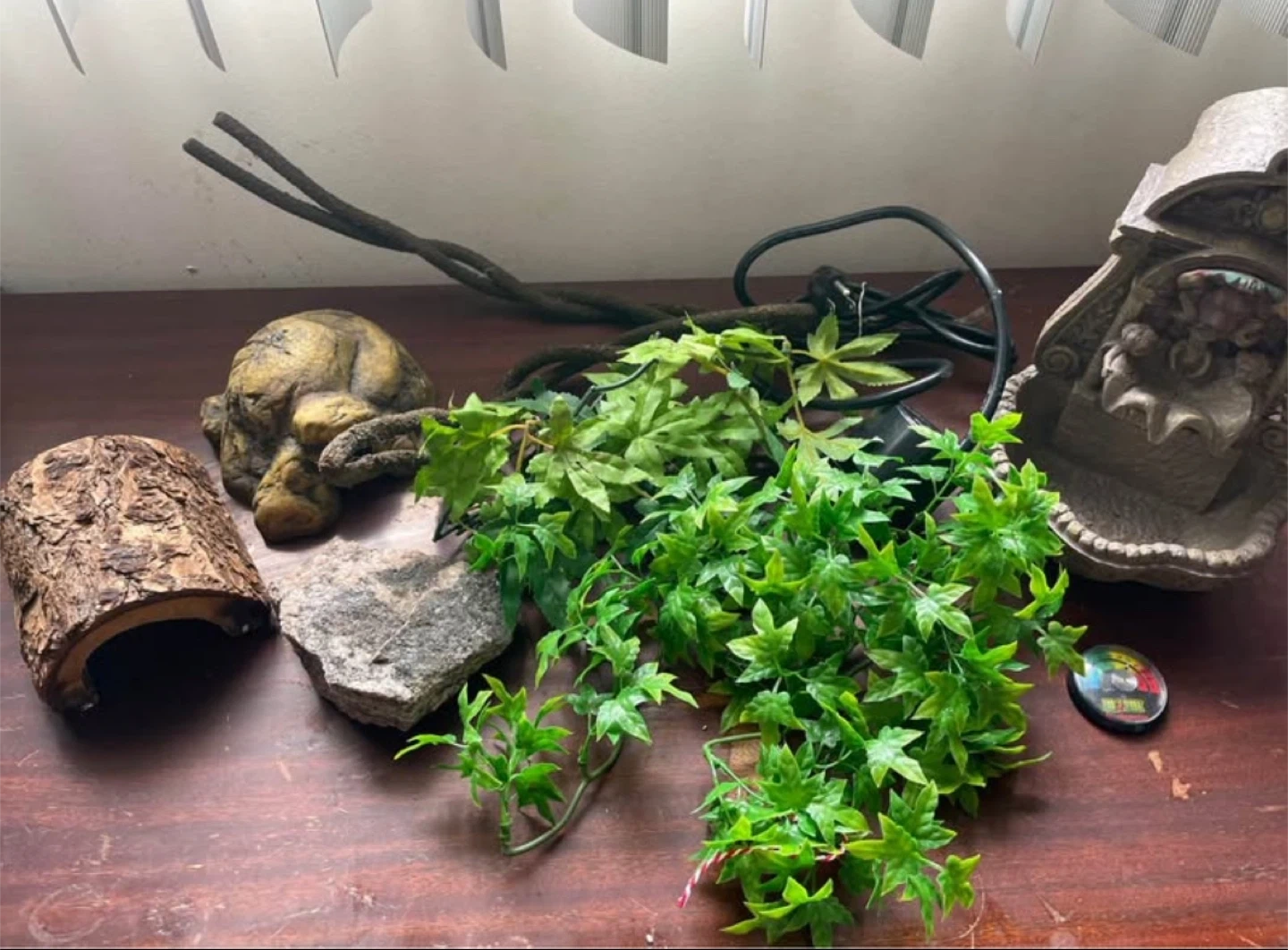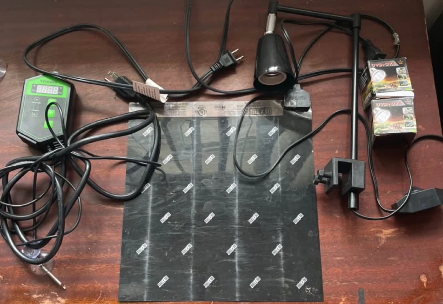 20 gallon breeder tank (30x12.5x12.5 inches) with mesh lid Includes: ExoTerra heat mat VIVOSUN thermostat control and probe Small heat lamp with 2 brand new UVA/UVB bulbs Faux rock hide Log hide Some fake plants, one with suction cups to attach for climbing if desired Decorative rock Can be a great home to various snakes, geckos, small lizards etc. Holds water last time it was leak tested as well. Prefer to sell as a set, asking $90 for all :)