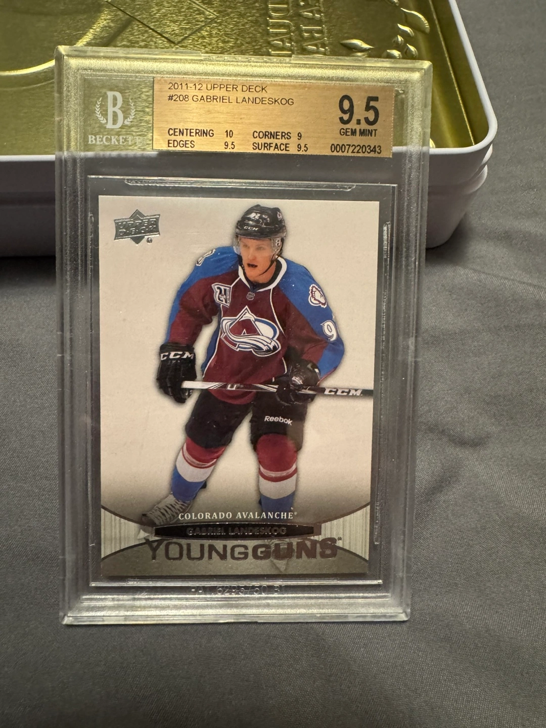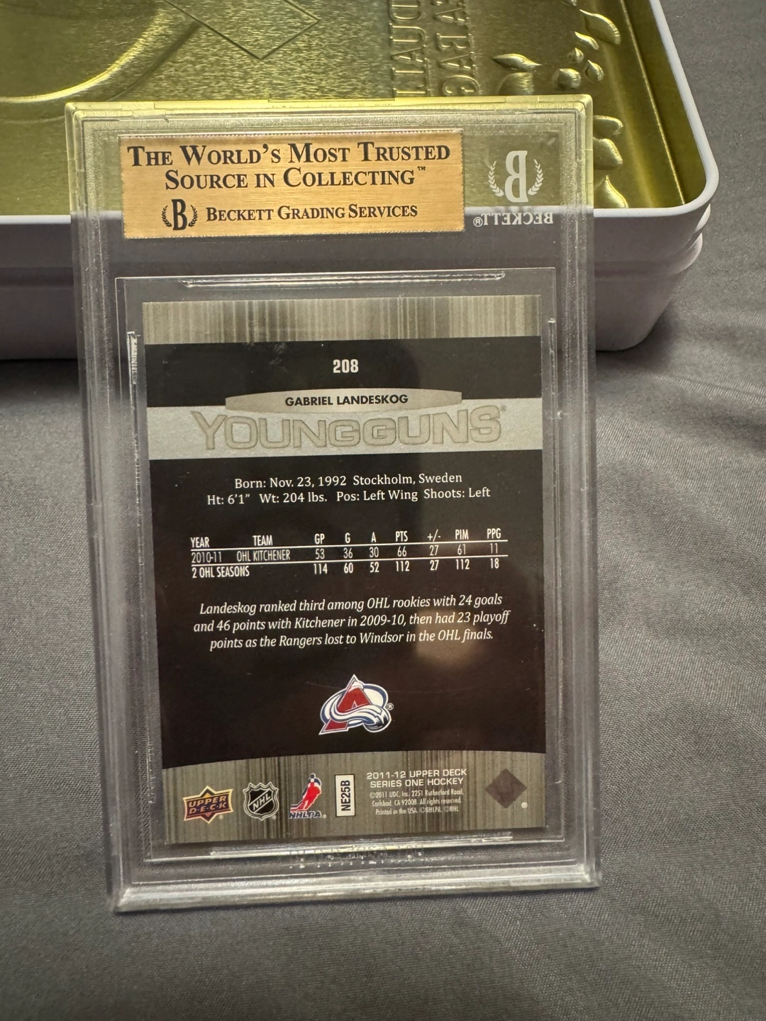 Selling a 2011-12 Upper Deck #208 Gabriel Landeskog Young Guns hockey card. It's graded by Beckett Grading Services (BGS) with a grade of 9.5 GEM MINT. Centering is 10, corners are 9, edges are 9.5, and surface is 9.5. A great addition to any hockey card collection!