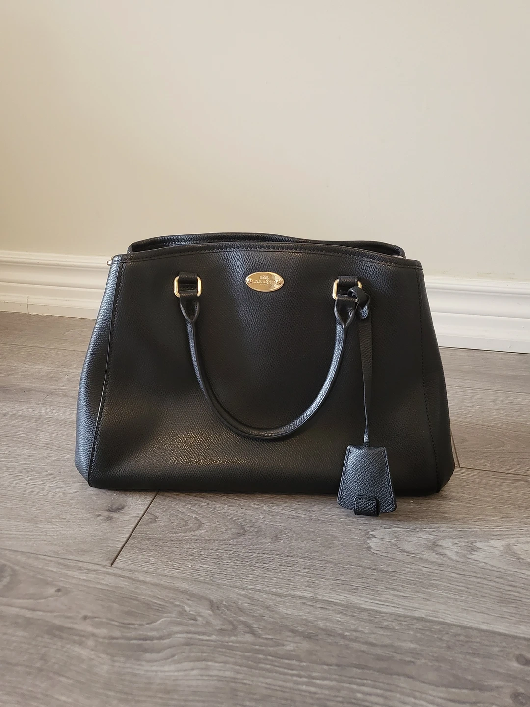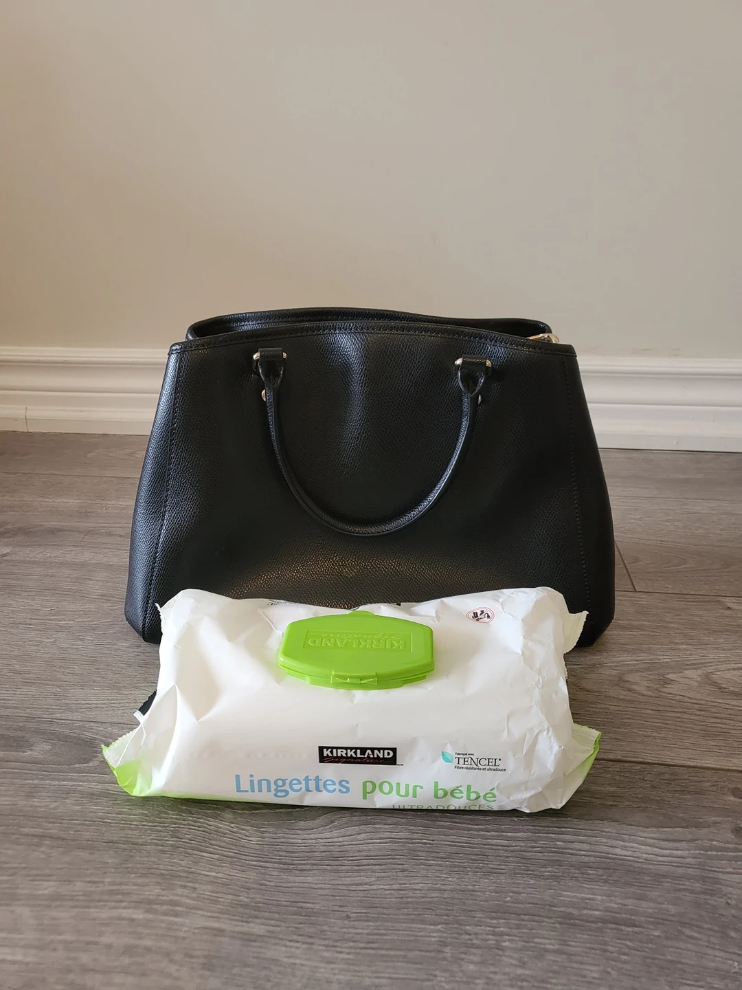 코치 정품 가방이고 사이즈 비교 하시라고 물티슈랑 같이 찍었어요ㅎ work bag 으로 잘 사용했는데 지금은 재택근무라 사용할 일이 없어서 팔아요