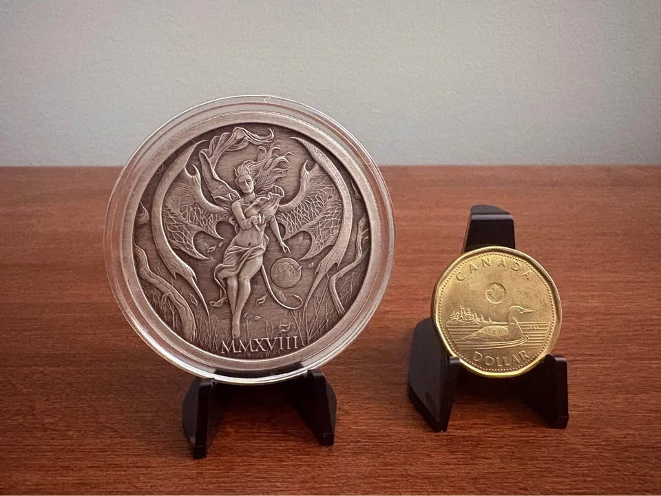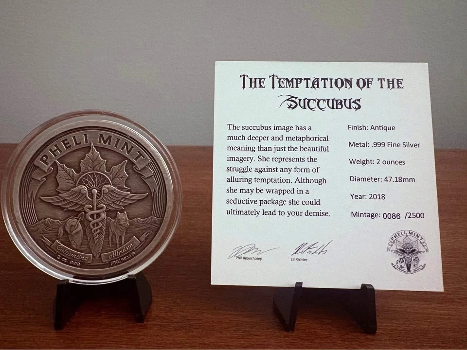 Highly collectible, limited mintage, serialized, artwork/certificate of authenticity, antiqued finish, encapsulated. This round literally has it all. Presenting two ounces of .999 Pure/Fine silver “The Temptation of the Succubus” round by Pheli Mint. Minted in 2018 (MMXVIII on the front) this round has an antiqued finish and a LOW serial # of 86/2500 antiqued pieces. Sigma precious metals verifier certified, see photos - they speak for themselves as to why these rounds are so highly sought after. I also have different 2oz Succubus designs with the same serial # 86 if you’re looking to put together a set let me know. **Serious inquiries only, please don’t send the automated “is it still available” message, I won’t answer. The item will be removed right away when sold. If the ad is up it is available** **Check out my other listings for more unique bullion items & gift ideas and feel free to follow my profile on Marketplace to be alerted FIRST when I post new items**. Thanks! Price can be subject to change with significant market fluctuations in silver spot price.