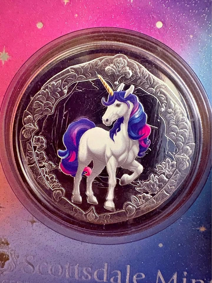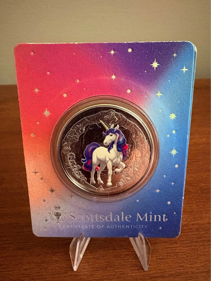 2024 Fiji 1 oz .999 pure/fine silver bullion purple magical unicorn “Azurea” round. In Brilliant uncirculated condition and housed in tamper-evident protective packaging. Pls pm me for photos of reverse if required, fb ai is erroneously flagging the post because of it so couldn’t post. **Only one available** Round Highlights: • Contains 1 oz of .999 fine silver with a prooflike finish. • Limited mintage of 1,500. • Each comes in Scottsdale Mint's special certi-lock packaging to verify authenticity. • Obverse: Design is complemented by magical stars and orbs around the Fiji coat of arms,metal fineness, year, weight and denomination. • Reverse: Features a majestic unicorn with a bright blue and purple flowing mane and horn turned in elegant display in a magical forest. • This coin is manufactured by Scottsdale Mint. Sigma precious metals verifier certified, see photos. Can meet in public place in Maple Ridge. Include stand - add $3 The stand is too thick to be purchased in person. **Serious inquiries only, please don’t send the automated “is it still available” message, I won’t answer. The item will be removed right away when sold. If the ad is up it is available. ** **Will combine ! Check out my other listings for more unique bullion items & gift ideas. Also, follow my profile to be notified first when I post new items!** Thanks! Price can be subject to change with significant market fluctuations in silver spot price.