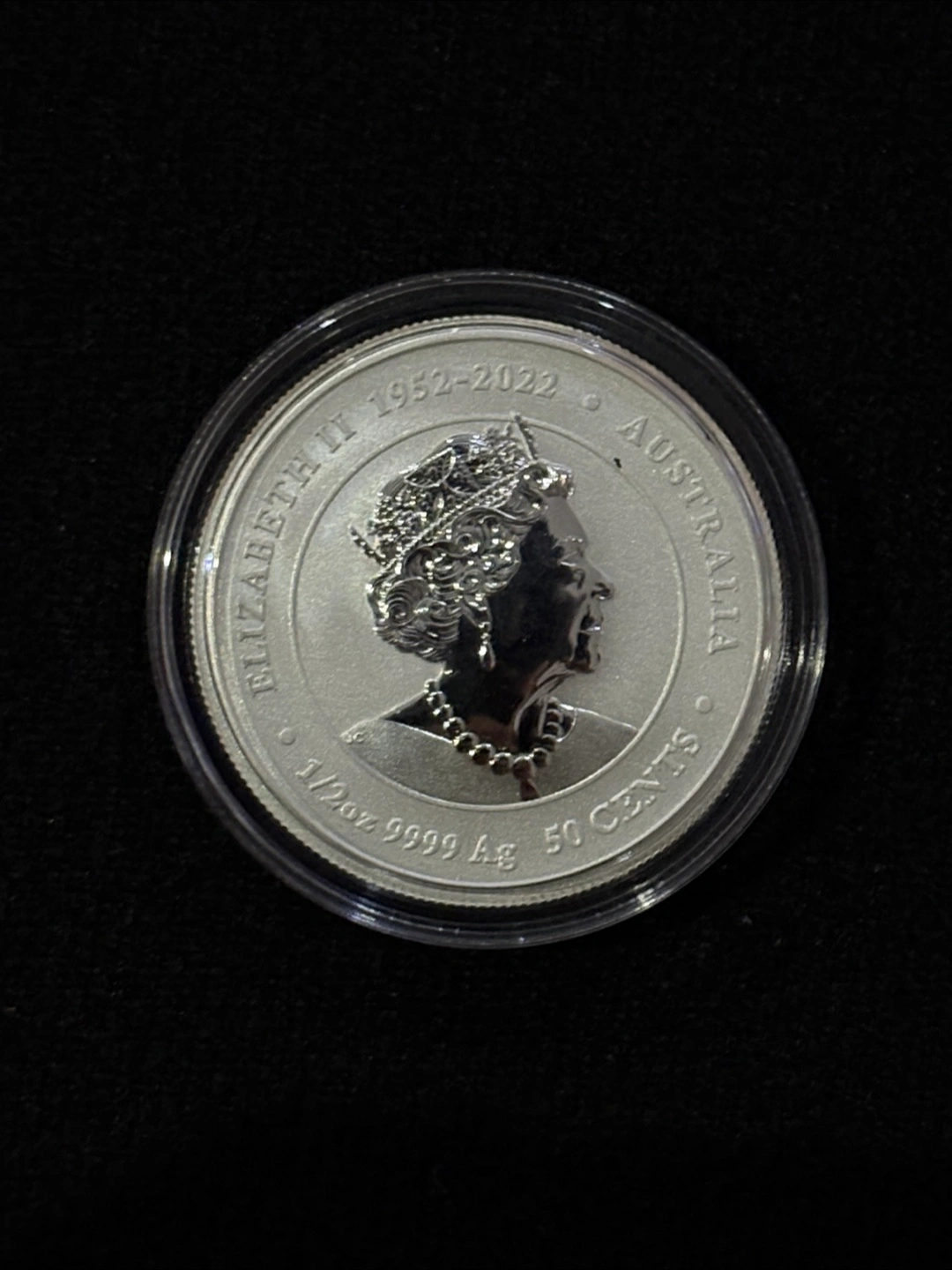 Selling a 2024 Dragon silver coin. It's a half ounce of 99.99% pure silver. The coin features a dragon design on one side and Queen Elizabeth II on the other. It's in great condition!