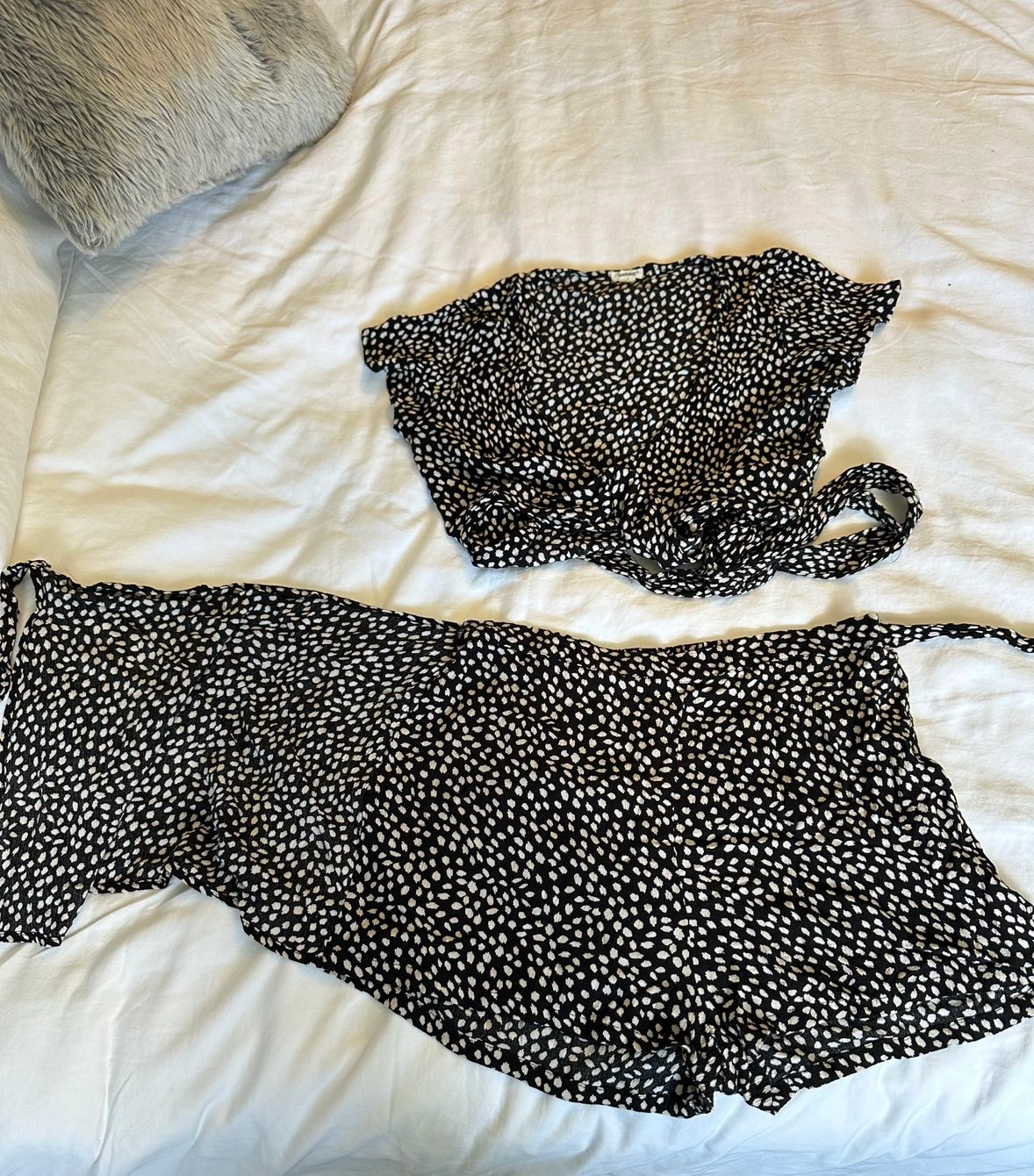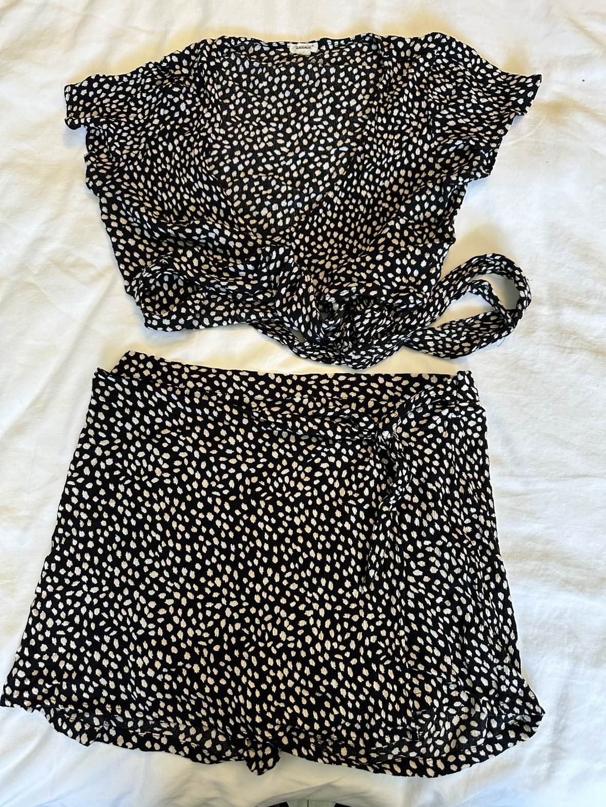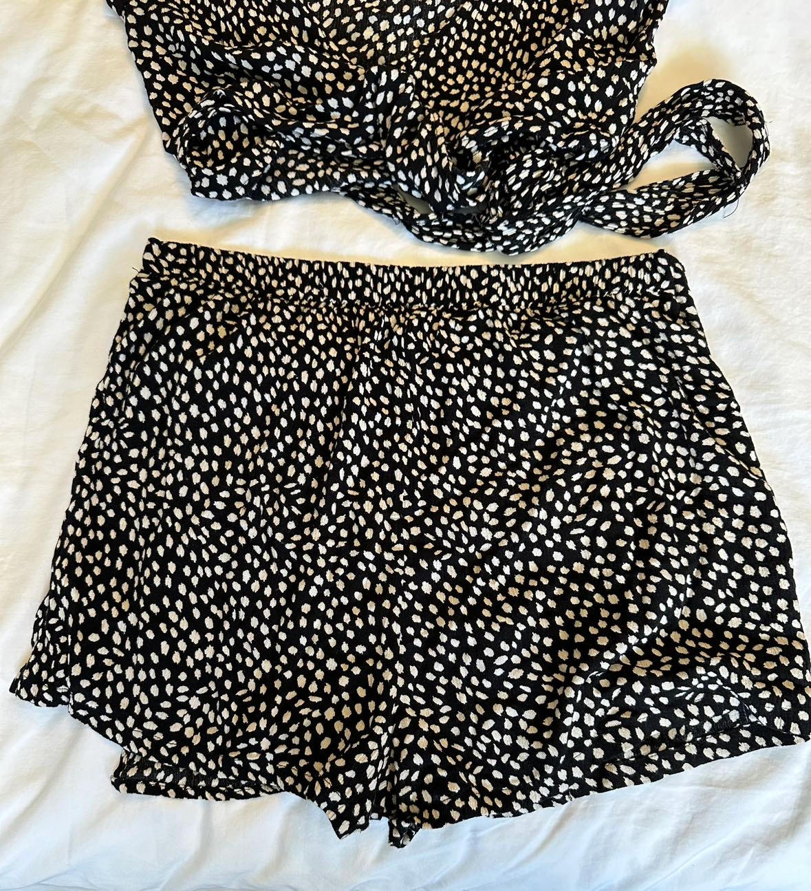 Excellent condition. Top - Small. Tie around top Bottom - Medium. Skort with tie front 100% Rayon